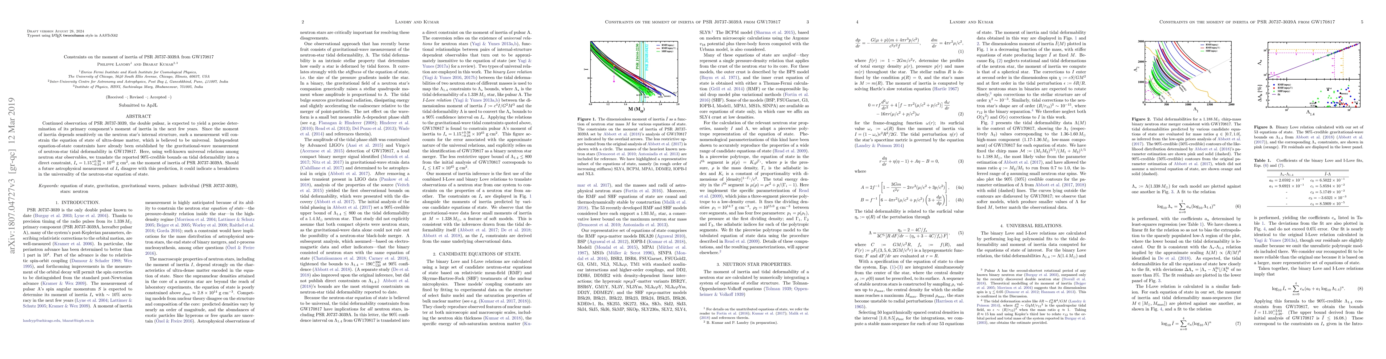 This paper translates gravitational-wave measurements from GW170817 into a constraint on the moment of inertia of PSR J0737-3039A, yielding $I_{\star} = 1.15^{+0.38}_{-0.24} \times 10^{45}$ g cm², which helps to constrain the equation of state of ultra-dense neutron star matter. Future measurements could reveal deviations indicating a breakdown in the universality of neutron star equations of state.