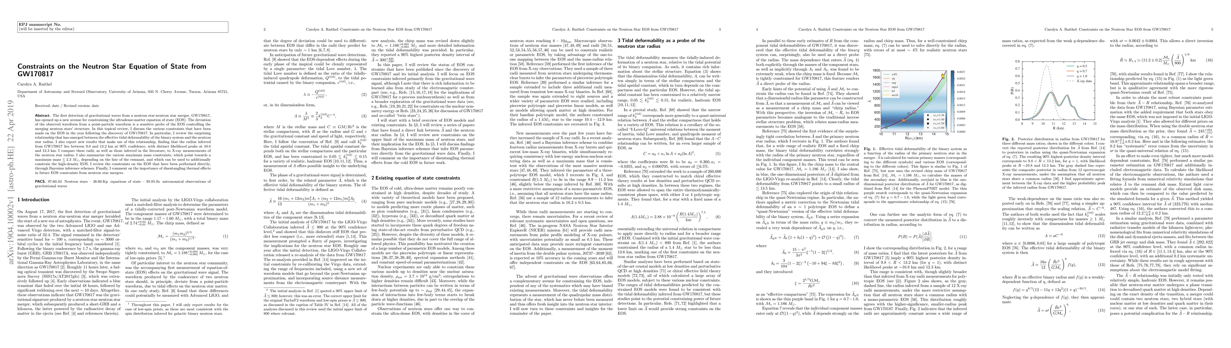 This paper reviews constraints on the neutron star equation of state (EOS) derived from the gravitational wave detection GW170817, finding that the neutron star radius lies between 9.8 and 13.2 km at 90% confidence. It also highlights maximum mass constraints indicating a value less than 2.3 solar masses, and discusses the importance of future thermal effect disentanglement in EOS studies.