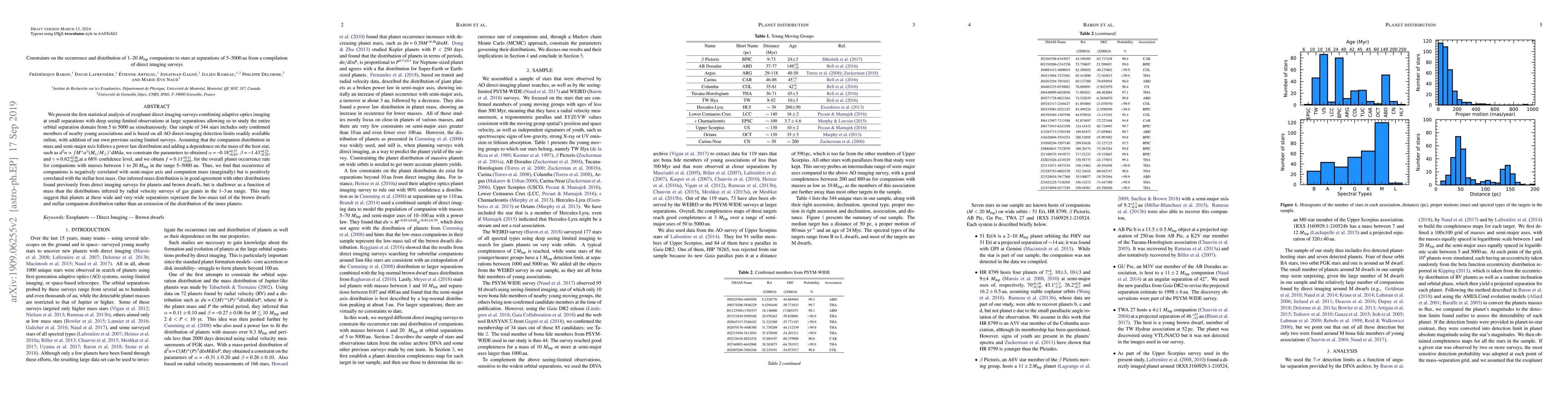 We present the first statistical analysis of exoplanet direct imaging surveys combining adaptive optics imaging at small separations with deep seeing-limited observations at large separations allowing us to study the entire orbital separation domain from 5 to 5000~au simultaneously. Our sample of 344 stars includes only confirmed members of nearby young associations and is based on all AO direct-imaging detection limits readily available online, with addition of our own previous seeing limited surveys. Assuming that the companion distribution in mass and semi-major axis follows a power law distribution and adding a dependence on the mass of the host star, such as $d^2n\propto fM^{\alpha}a^{\beta} (M_\star/M_{\odot})^{\gamma}$d$ M $d$a$, we constrain the parameters to obtained $\alpha=-0.18^{+0.77}_{-0.65}$, $\beta=-1.43^{+0.23}_{-0.24}$, and $\gamma=0.62^{+0.56}_{-0.50}$,at a 68\% confidence level, and we obtain $f=0.11^{+0.11}_{-0.05}$, for the overall planet occurrence rate for companions with masses between 1 to 20~\mj\ in the range 5--5000~au. Thus, we find that occurrence of companions is negatively correlated with semi-major axis and companion mass (marginally) but is positively correlated with the stellar host mass. Our inferred mass distribution is in good agreement with other distributions found previously from direct imaging surveys for planets and brown dwarfs, but is shallower as a function of mass than the distributions inferred by radial velocity surveys of gas giants in the 1--3\,au range. This may suggest that planets at these wide and very-wide separations represent the low-mass tail of the brown dwarfs and stellar companion distribution rather than an extension of the distribution of the inner planets.