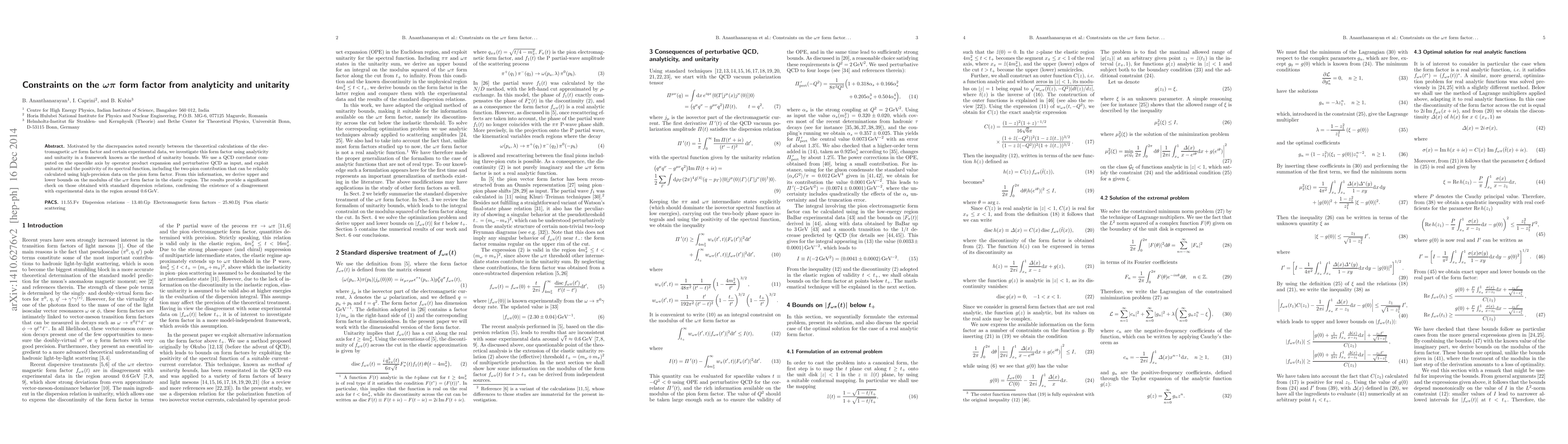 This paper investigates the $\omega\pi$ form factor using the method of unitarity bounds, deriving upper and lower bounds based on analyticity, unitarity, and high-precision data on the pion form factor. It confirms a discrepancy with experimental data around 0.6 GeV, providing a critical check on standard dispersion relation results.