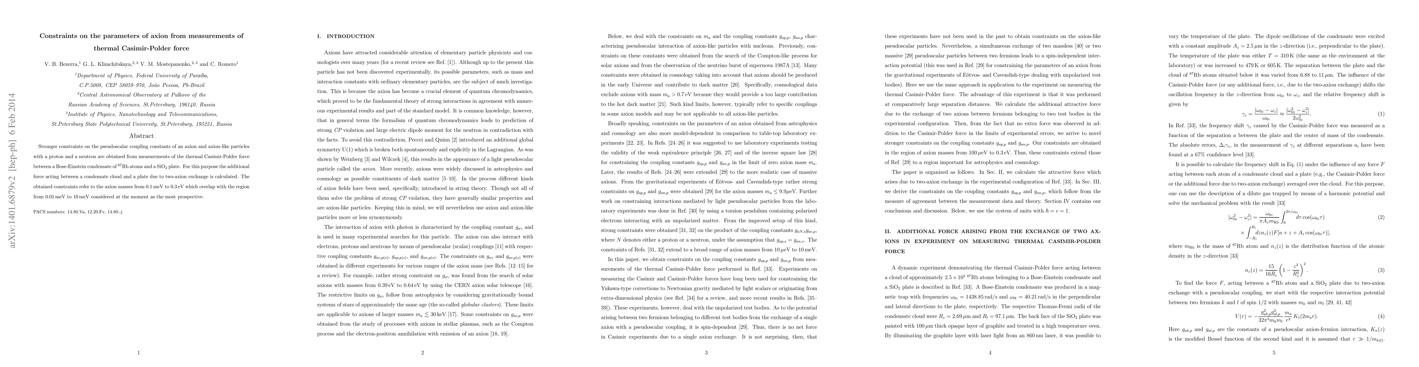 Stronger constraints on the pseudoscalar coupling constants of an axion and axion-like particles with a proton and a neutron are obtained from measurements of the thermal Casimir-Polder force between a Bose-Einstein condensate of $^{87}$Rb atoms and a SiO$_2$ plate. For this purpose the additional force acting between a condensate cloud and a plate due to two-axion exchange is calculated. The obtained constraints refer to the axion masses from 0.1meV to 0.3eV which overlap with the region from 0.01meV to 10meV considered at the moment as the most prospective.