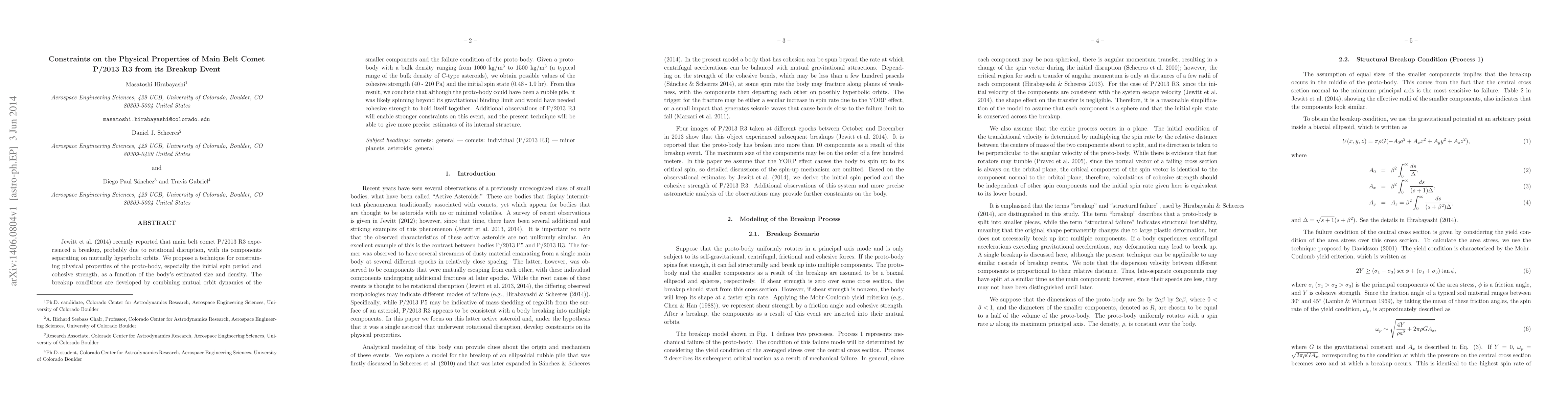 Jewitt et al. (2014) analyzed the breakup of main belt comet P/2013 R3, proposing a method to estimate its initial spin period and cohesive strength. They found the proto-body likely had a spin period of 0.48 - 1.9 hr and cohesive strength of 40 - 210 Pa, indicating it was spinning beyond its gravitational limits.
