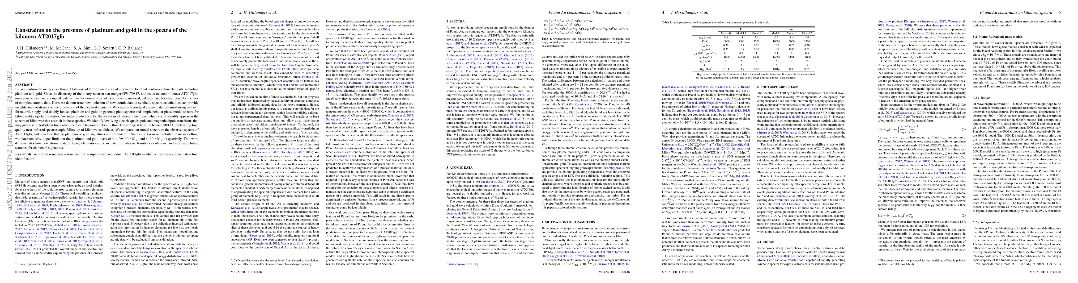 New atomic data for platinum and gold were used to analyze kilonova AT2017gfo spectra, yielding no prominent signatures of these heavy elements. Tentative upper limits on their masses were also placed.