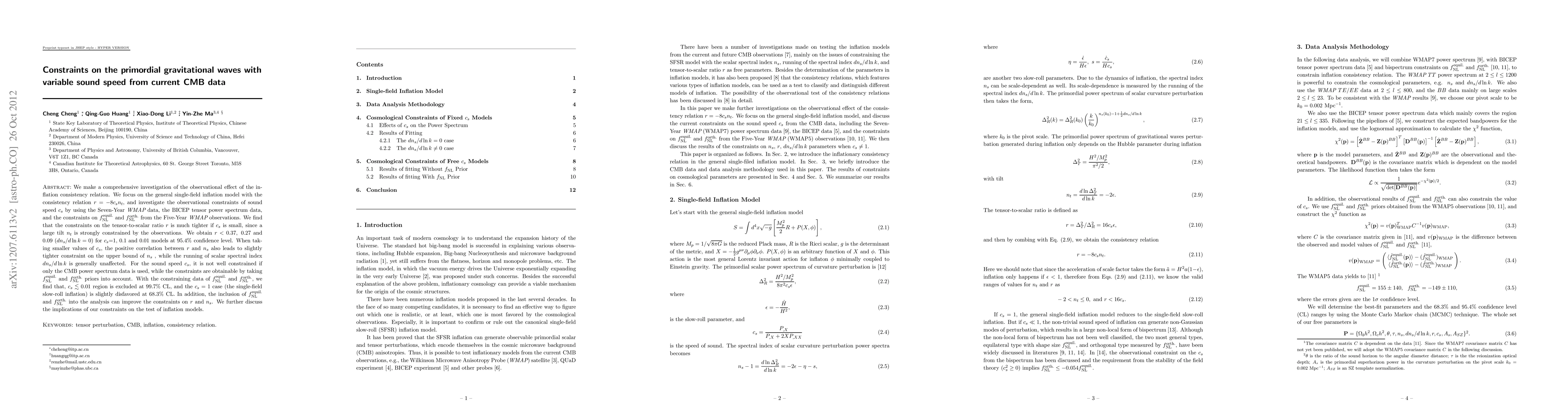 We make a comprehensive investigation of the observational effect of the inflation consistency relation. We focus on the general single-field inflation model with the consistency relation $r=-8c_s n_t$, and investigate the observational constraints of sound speed $c_s$ by using the Seven-Year WMAP data, the BICEP tensor power spectrum data, and the constraints on $f_{\rm NL}^{\rm equil.}$ and $f_{\rm NL}^{\rm orth.}$ from the Five-Year WMAP observations. We find that the constraints on the tensor-to-scalar ratio $r$ is much tighter if $c_s$ is small, since a large tilt $n_t$ is strongly constrained by the observations. We obtain $r<0.37, 0.27$ and 0.09 ($dn_s/d\ln k=0$) for $c_s$=1, 0.1 and 0.01 models at 95.4% confidence level. When taking smaller values of $c_s$, the positive correlation between $r$ and $n_s$ also leads to slightly tighter constraint on the upper bound of $n_s$, while the running of scalar spectral index $dn_s/d\ln k$ is generally unaffected. For the sound speed $c_s$, it is not well constrained if only the CMB power spectrum data is used, while the constraints are obtainable by taking $f_{\rm NL}^{\rm equil.}$ and $f_{\rm NL}^{\rm orth.}$ priors into account. With the constraining data of $f_{\rm NL}^{\rm equil.}$ and $f_{\rm NL}^{\rm orth.}$, we find that, $c_s\lesssim 0.01$ region is excluded at 99.7% CL, and the $c_s=1$ case (the single-field slow-roll inflation) is slightly disfavored at 68.3% CL. In addition, the inclusion of $f_{\rm NL}^{\rm equil.}$ and $f_{\rm NL}^{\rm orth.}$ into the analysis can improve the constraints on $r$ and $n_s$. We further discuss the implications of our constraints on the test of inflation models.