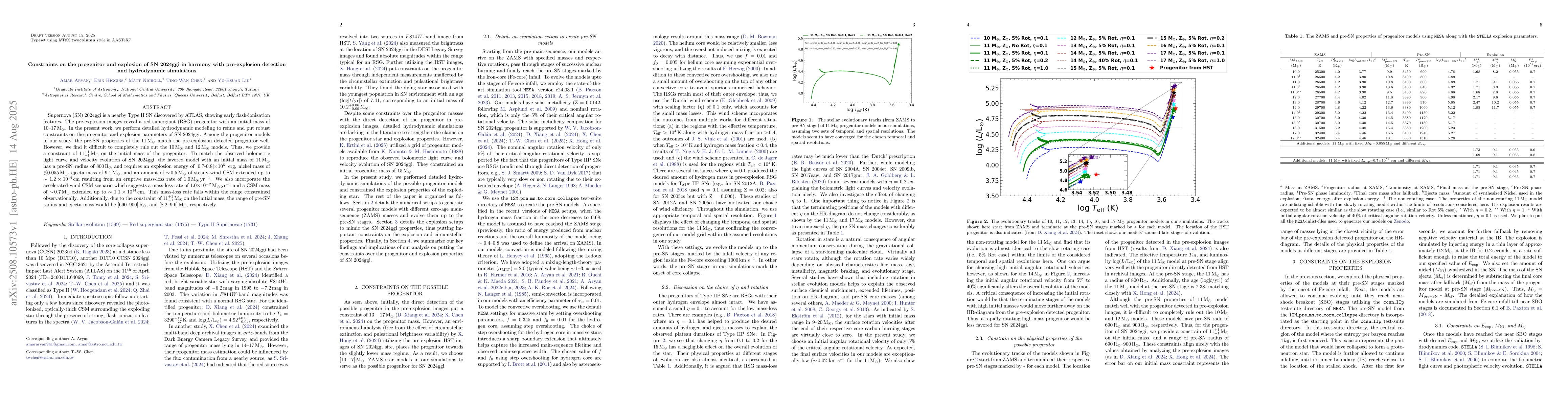 Supernova (SN) 2024ggi is a nearby Type II SN discovered by ATLAS, showing early flash-ionization features. The pre-explosion images reveal a red supergiant (RSG) progenitor with an initial mass of 10-17 M$_\odot$. In the present work, we perform detailed hydrodynamic modeling to refine and put robust constraints on the progenitor and explosion parameters of SN 2024ggi. Among the progenitor models in our study, the pre-SN properties of the 11 M$_{\odot}$ match the pre-explosion detected progenitor well. However, we find it difficult to completely rule out the 10 M$_{\odot}$ and 12 M$_{\odot}$ models. Thus, we provide a constraint of 11$^{+1}_{-1}$ M$_{\odot}$ on the initial mass of the progenitor. To match the observed bolometric light curve and velocity evolution of SN 2024ggi, the favored model with an initial mass of 11 M$_{\odot}$ has a pre-SN radius of 800 R$_{\odot}$ and requires an explosion energy of [0.7-0.8]$\times$10$^{51}$ erg, nickel mass of $\lesssim$0.055 M$_{\odot}$, ejecta mass of 9.1 M$_{\odot}$, and an amount of $\sim$ 0.5 M$_{\odot}$ of steady-wind CSM extended up to $\sim1.2\times10^{14}$ cm resulting from an eruptive mass-loss rate of 1.0 M$_{\odot}$ yr$^{-1}$. We also incorporate the accelerated-wind CSM scenario which suggests a mass-loss rate of 1.0$\times10^{-2}$ M$_{\odot}$ yr$^{-1}$ and a CSM mass of $\sim$ 0.7 M$_{\odot}$ extended up to $\sim1.1\times10^{14}$ cm. This mass-loss rate falls within the range constrained observationally. Additionally, due to the constraint of 11$^{+1}_{-1}$ M$_{\odot}$ on the initial mass, the range of pre-SN radius and ejecta mass would be [690-900] R$_{\odot}$, and [8.2-9.6] M$_{\odot}$, respectively.