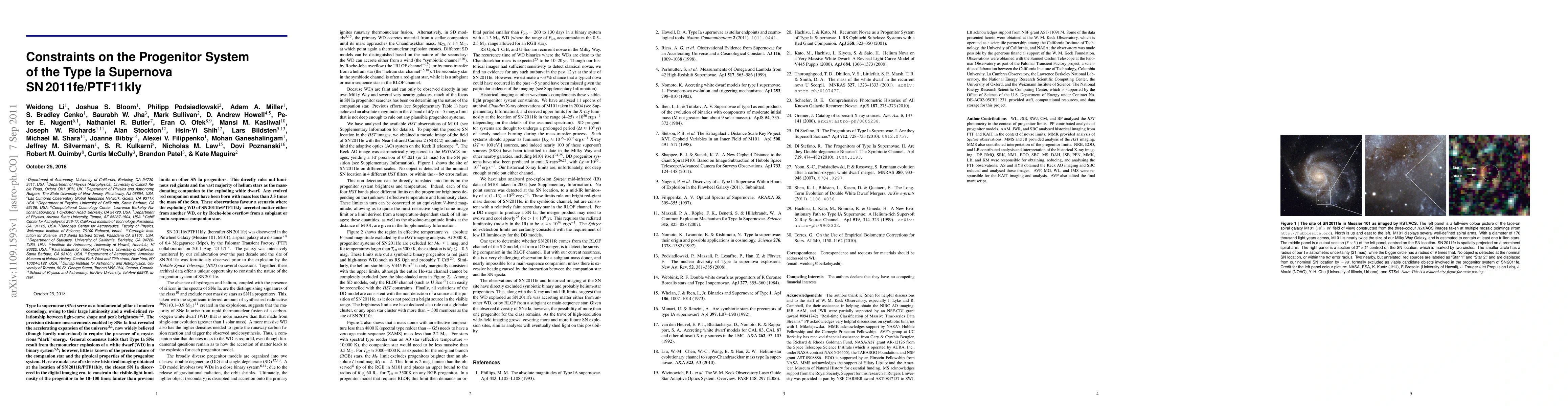 A new study uses historical imaging to constrain the progenitor system of Type Ia supernova SN 2011fe/PTF11kly, ruling out luminous red giants and most helium stars as companions, and suggesting a white dwarf may have accreted matter from another WD or main-sequence star.