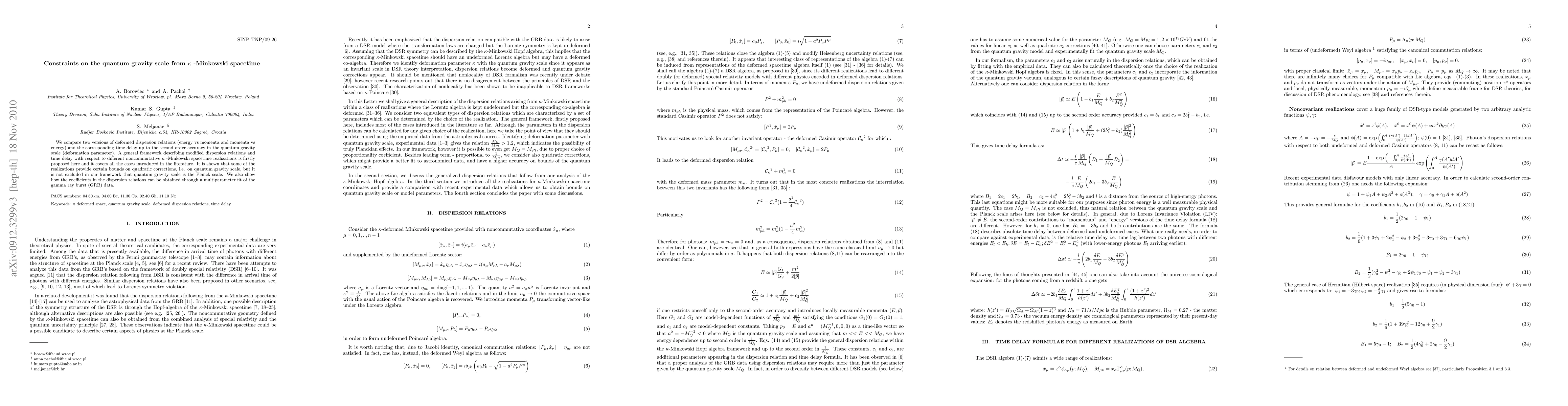 We compare two versions of deformed dispersion relations (energy vs momenta and momenta vs energy) and the corresponding time delay up to the second order accuracy in the quantum gravity scale (deformation parameter). A general framework describing modified dispersion relations and time delay with respect to different noncommutative kappa -Minkowski spacetime realizations is firstly proposed here and it covers all the cases introduced in the literature. It is shown that some of the realizations provide certain bounds on quadratic corrections, i.e. on quantum gravity scale, but it is not excluded in our framework that quantum gravity scale is the Planck scale. We also show how the coefficients in the dispersion relations can be obtained through a multiparameter fit of the gamma ray burst (GRB) data.