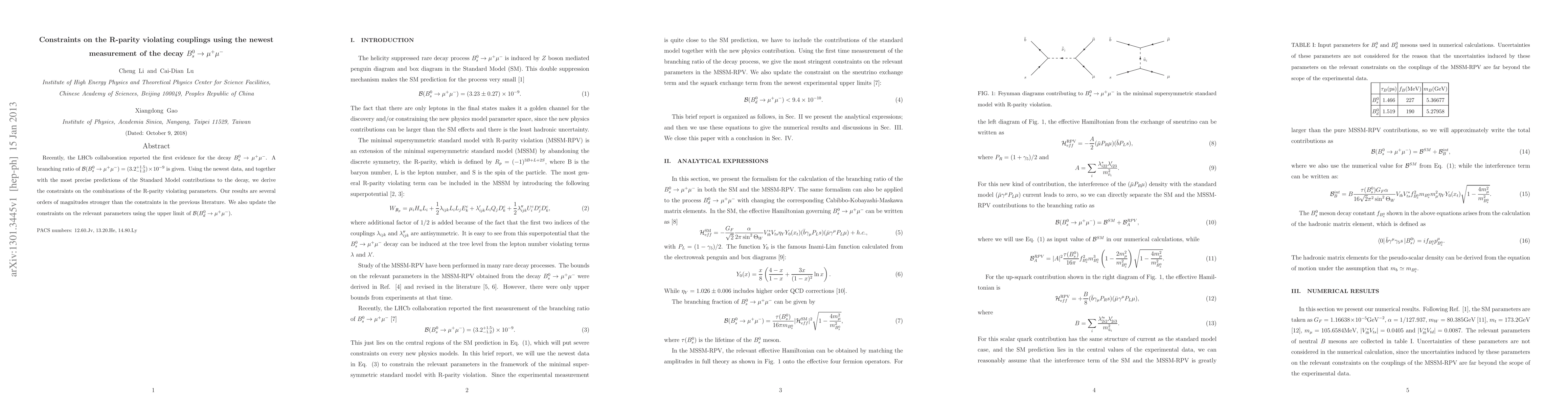 Recently, the LHCb collaboration reported the first evidence for the decay $B_s^0 \rightarrow \mu^+ \mu^-$. A branching ratio of $\mathcal{B}(B_s^0 \rightarrow \mu^+ \mu^-) = (3.2^{+1.5}_{-1.2}) \times 10^{-9}$ is given. Using the newest data, and together with the most precise predictions of the Standard Model contributions to the decay, we derive the constraints on the combinations of the R-parity violating parameters. Our results are several orders of magnitudes stronger than the constraints in the previous literature. We also update the constraints on the relevant parameters using the upper limit of $\mathcal{B}(B_d^0 \rightarrow \mu^+ \mu^-)$.