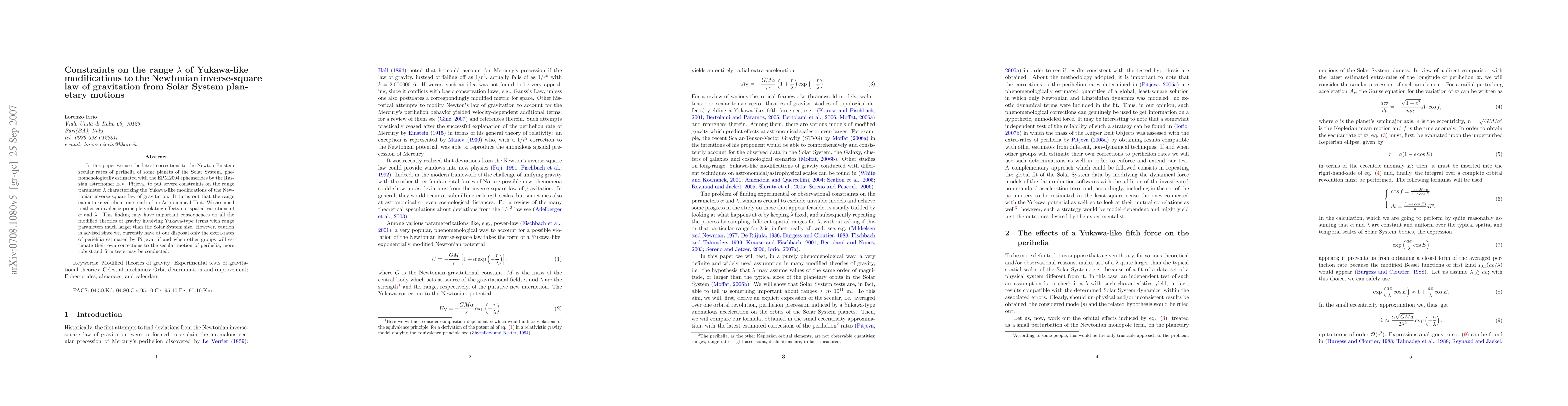 In this paper we use the latest corrections to the Newton-Einstein secular perihelion rates of some planets of the Solar System, phenomenologically estimated with the EPM2004 ephemerides by the Russian astronomer E.V. Pitjeva, to put severe constraints on the range parameter lambda characterizing the Yukawa-like modifications of the Newtonian inverse-square law of gravitation. It turns out that the range cannot exceed about one tenth of an Astronomical Unit. We assumed neither equivalence principle violating effects nor spatial variations of $\alpha$ and $\lambda$. This finding may have important consequences on all the modified theories of gravity involving Yukawa-type terms with range parameters much larger than the Solar System size. However, caution is advised since we, currently have at our disposal only the periehlion extra-rates estimated by Pitjeva: if and when other groups will estimate their own corrections to the secular motion of perihelia, more robust and firm tests may be conducted.