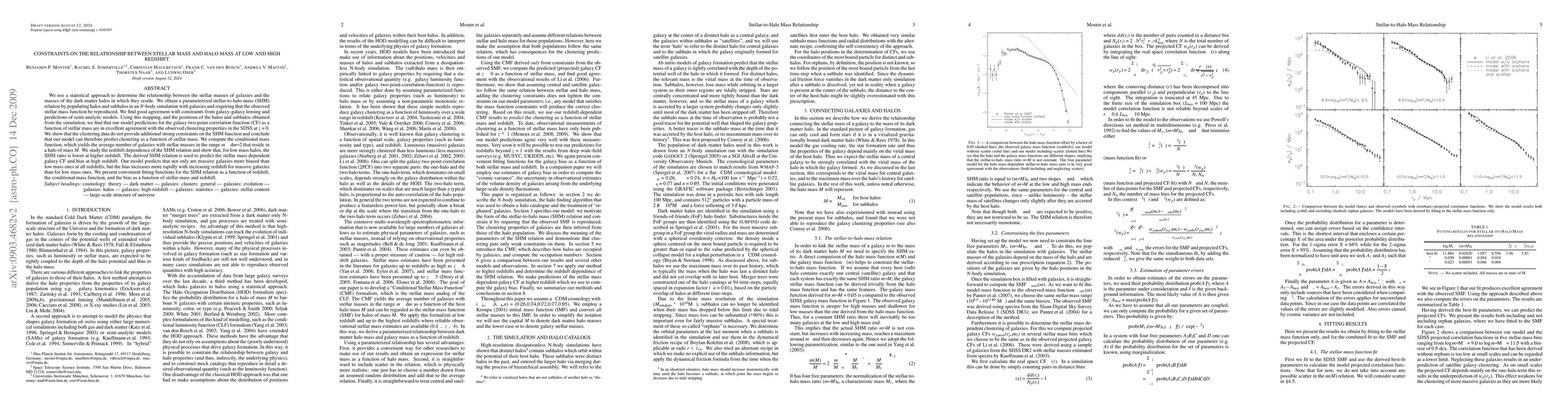 This paper develops a statistical model to determine the relationship between stellar mass and dark matter halo mass across different redshifts, finding that the SHM ratio is lower at higher redshifts for low mass halos. The model predicts galaxy clustering and bias as a function of stellar mass, showing that massive galaxies exhibit greater and more rapidly increasing bias with redshift compared to low mass galaxies.