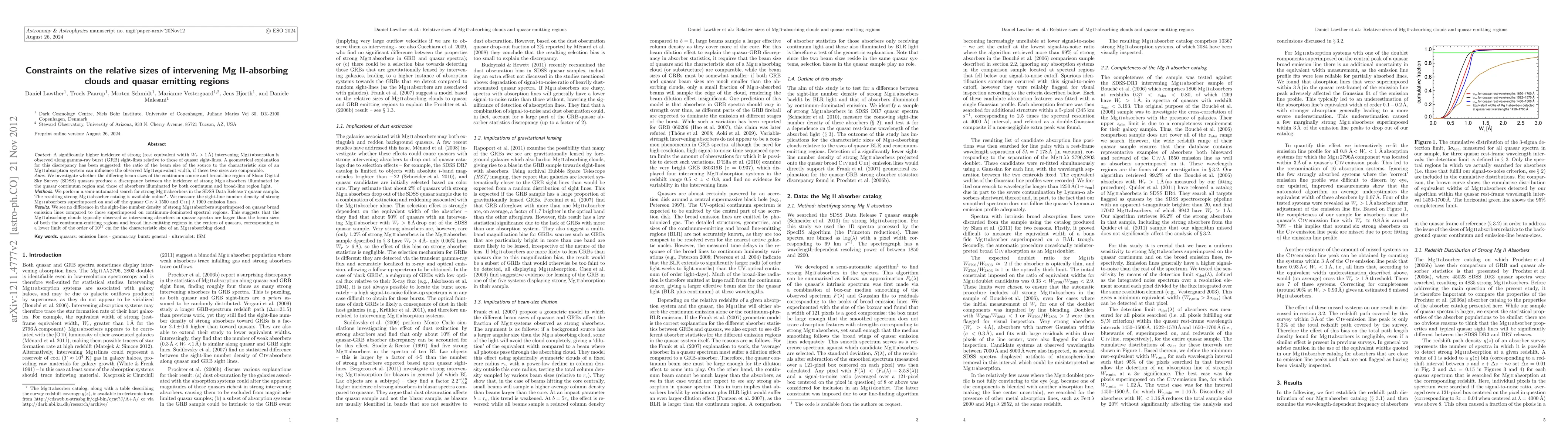 A study of quasar spectra found that intervening Mg II-absorbing clouds are larger than the beam sizes of both quasar continuum and broad-line emission regions, with a characteristic size of at least 10^17 cm.
