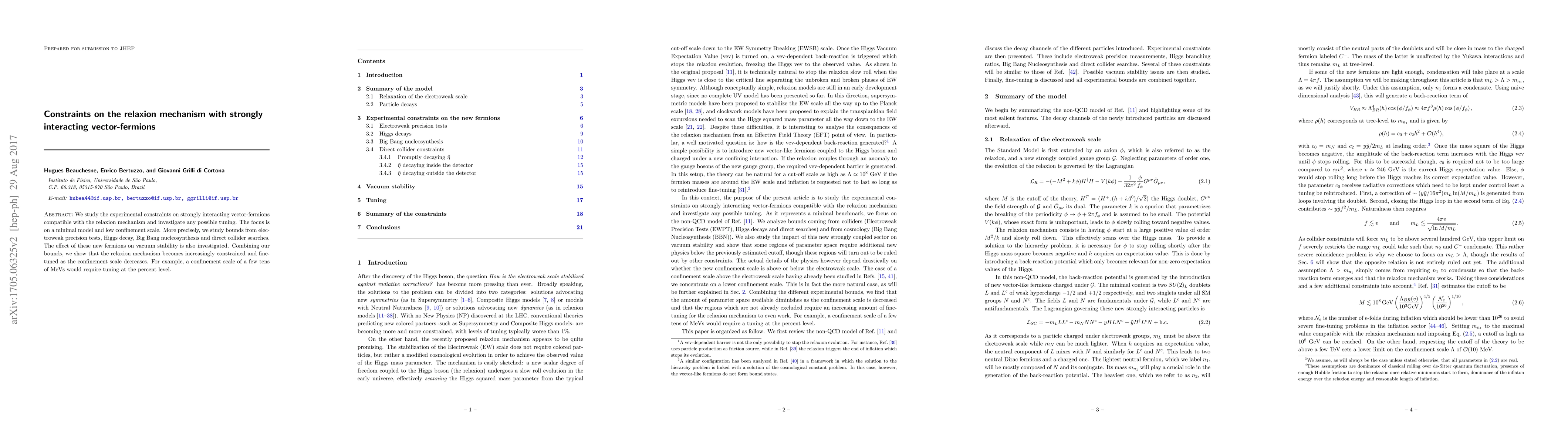 We study the experimental constraints on strongly interacting vector-fermions compatible with the relaxion mechanism and investigate any possible tuning. The focus is on a minimal model and low confinement scale. More precisely, we study bounds from electroweak precision tests, Higgs decay, Big Bang nucleosynthesis and direct collider searches. The effect of these new fermions on vacuum stability is also investigated. Combining our bounds, we show that the relaxion mechanism becomes increasingly constrained and fine-tuned as the confinement scale decreases. For example, a confinement scale of a few tens of MeVs would require tuning at the percent level.