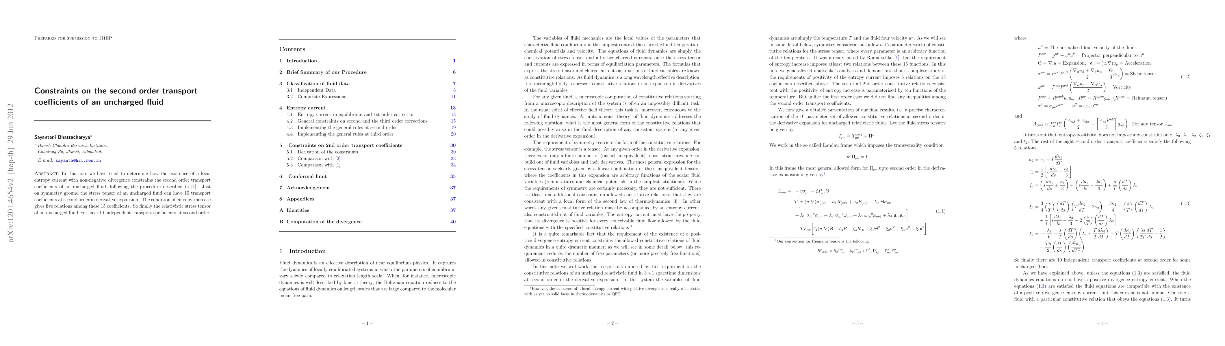 Researchers found that an uncharged fluid's stress tensor can have 10 independent transport coefficients at second order due to constraints from entropy-increase conditions.