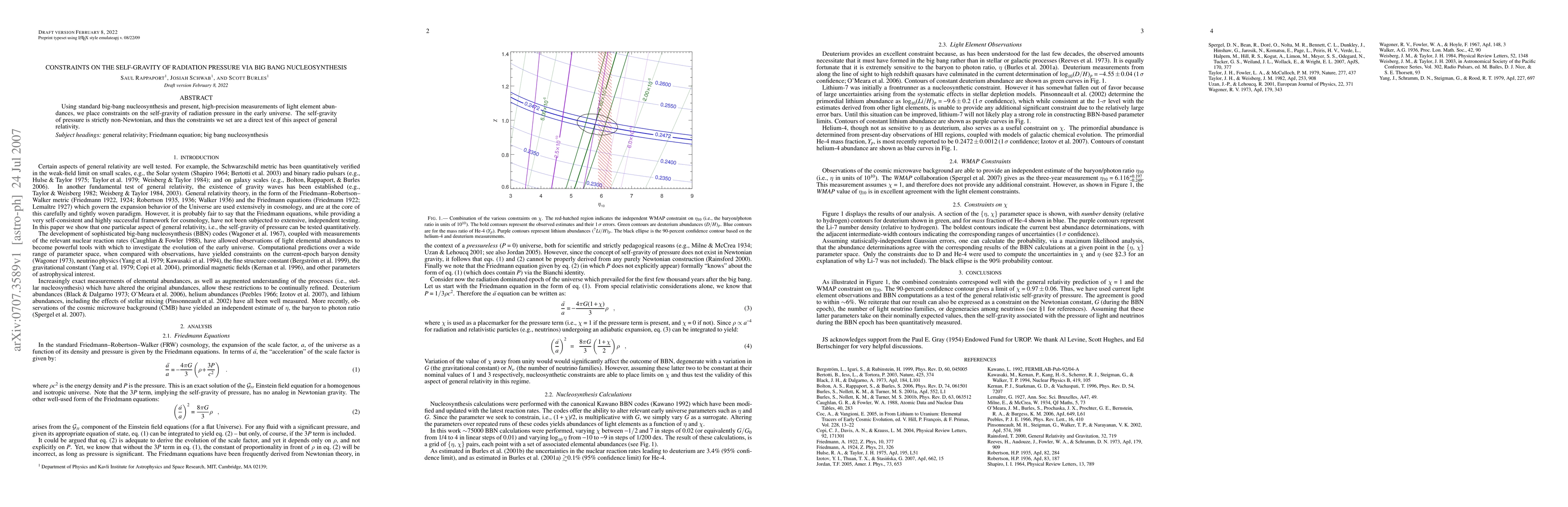 This paper uses big-bang nucleosynthesis and precise measurements of light element abundances to constrain the self-gravity of radiation pressure in the early universe, providing a direct test of non-Newtonian gravitational effects predicted by general relativity.