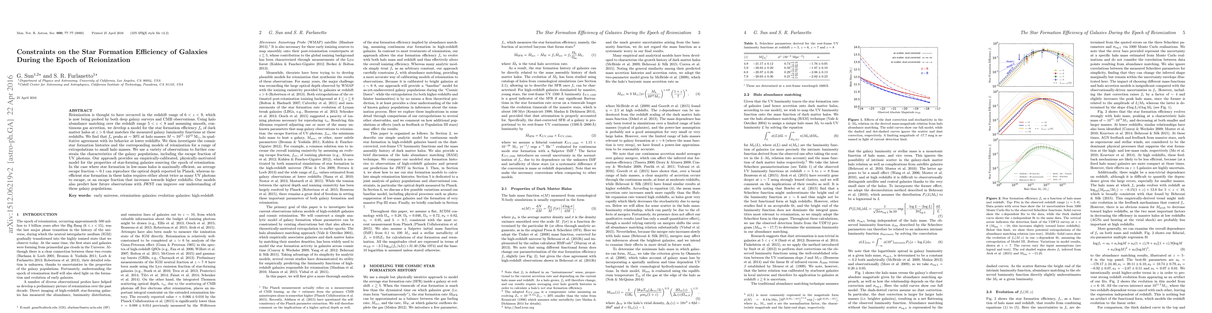 This paper develops a model for star formation efficiency during the epoch of reionization, finding that $f_{\star}$ peaks at $\sim 30\%$ for halo masses $M \sim 10^{11}$--$10^{12}$~M$_\odot$. It suggests that an escape fraction of UV photons of $\sim0.1$ can reproduce the optical depth reported by Planck, with implications for future JWST observations.
