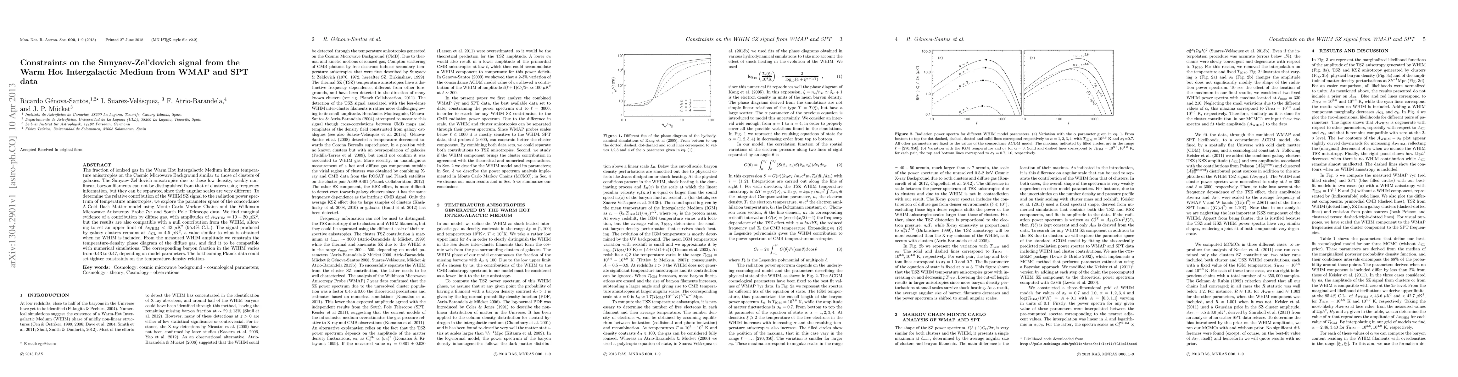 The fraction of ionized gas in the Warm Hot Intergalactic Medium induces temperature anisotropies on the Cosmic Microwave Background similar to those of clusters of galaxies. The Sunyaev-Zel'dovich anisotropies due to these low density, weakly non-linear, baryon filaments can not be distinguished from that of clusters using frequency information, but they can be separated since their angular scales are very different. To determine the relative contribution of the WHIM SZ signal to the radiation power spectrum of temperature anisotropies, we explore the parameter space of the concordance LCDM model using Monte Carlo Markov Chains and the Wilkinson Microwave Anisotropy Probe 7yr and South Pole Telescope data. We find marginal evidence of a contribution by diffuse gas, with amplitudes of A_WHIM=10-20 muK^2, but the results are also compatible with a null contribution from the WHIM, allowing to set an upper limit of A_WHIM < 43 muK^2 (95.4% C.L.). The signal produced by galaxy clusters remains at A_CL=4.5 muK^2, a value similar to what is obtained when no WHIM is included. From the measured WHIM amplitude we constrain the temperature-density phase diagram of the diffuse gas, and find it to be compatible with numerical simulations. The corresponding baryon fraction in the WHIM varies from 0.43 to 0.47, depending on model parameters. Planck data could set tighter constraints on the temperature-density relation.