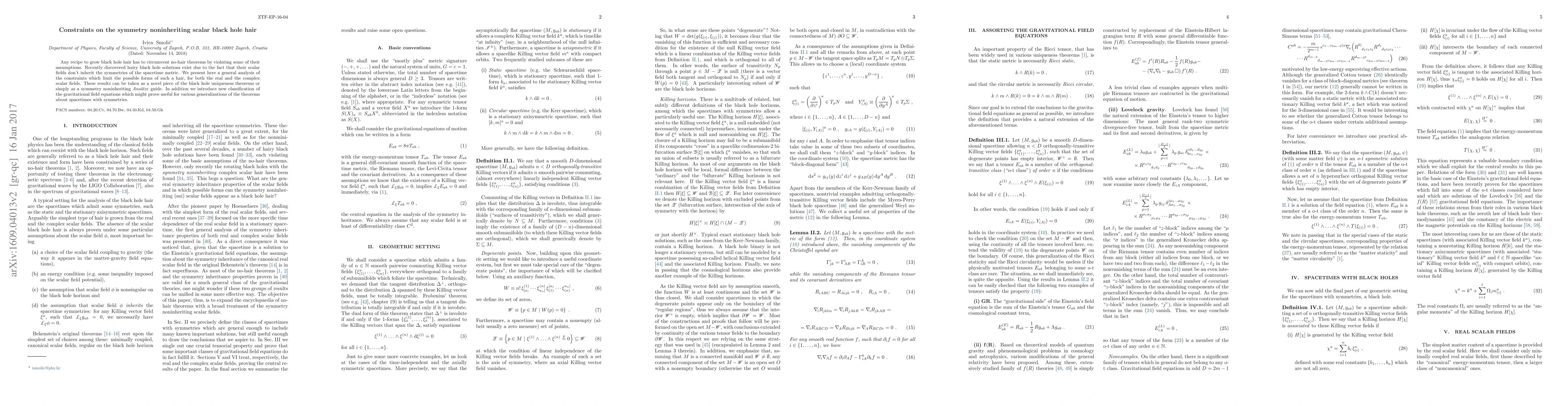 This paper analyzes constraints on scalar fields that allow for "hair" in black holes, which do not inherit the symmetries of the spacetime metric, thus circumventing no-hair theorems. It provides a classification of these scalar fields and introduces new methods for understanding gravitational field equations, potentially aiding in generalizations of black hole uniqueness theorems.