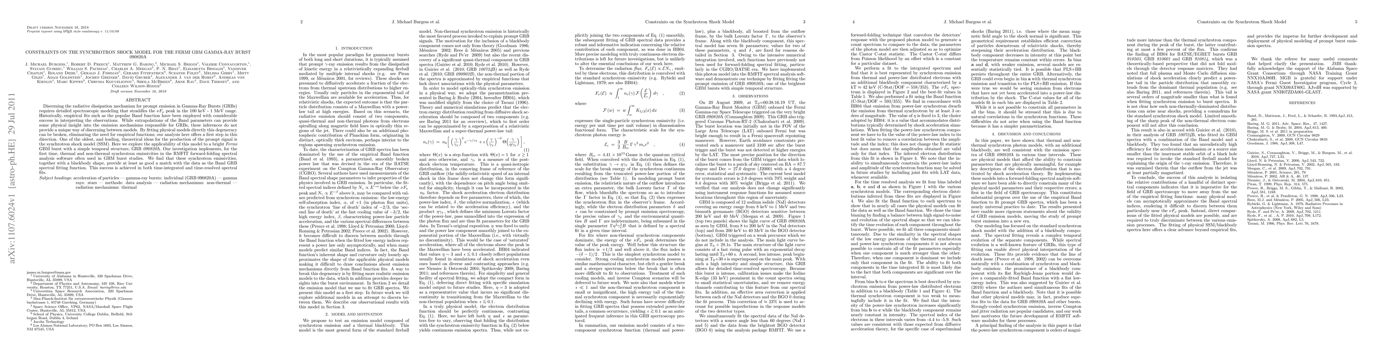 Discerning the radiative dissipation mechanism for prompt emission in Gamma-Ray Bursts (GRBs) requires detailed spectroscopic modeling that straddles the $\nu F_{\nu}$ peak in the 100 keV - 1 MeV range. Historically, empirical fits such as the popular Band function have been employed with considerable success in interpreting the observations. While extrapolations of the Band parameters can provide some physical insight into the emission mechanisms responsible for GRBs, these inferences do not provide a unique way of discerning between models. By fitting physical models directly this degeneracy can be broken, eliminating the need for empirical functions; our analysis here offers a first step in this direction. One of the oldest, and leading, theoretical ideas for the production of the prompt signal is the synchrotron shock model (SSM). Here we explore the applicability of this model to a bright {\it Fermi} GBM burst with a simple temporal structure, GRB {\it 090820}A. Our investigation implements, for the first time, thermal and non-thermal synchrotron emissivities in the RMFIT forward-folding spectral analysis software often used in GBM burst studies. We find that these synchrotron emissivities, together with a blackbody shape, provide at least as good a match with the data as the Band GRB spectral fitting function. This success is achieved in both time-integrated and time-resolved spectral fits.