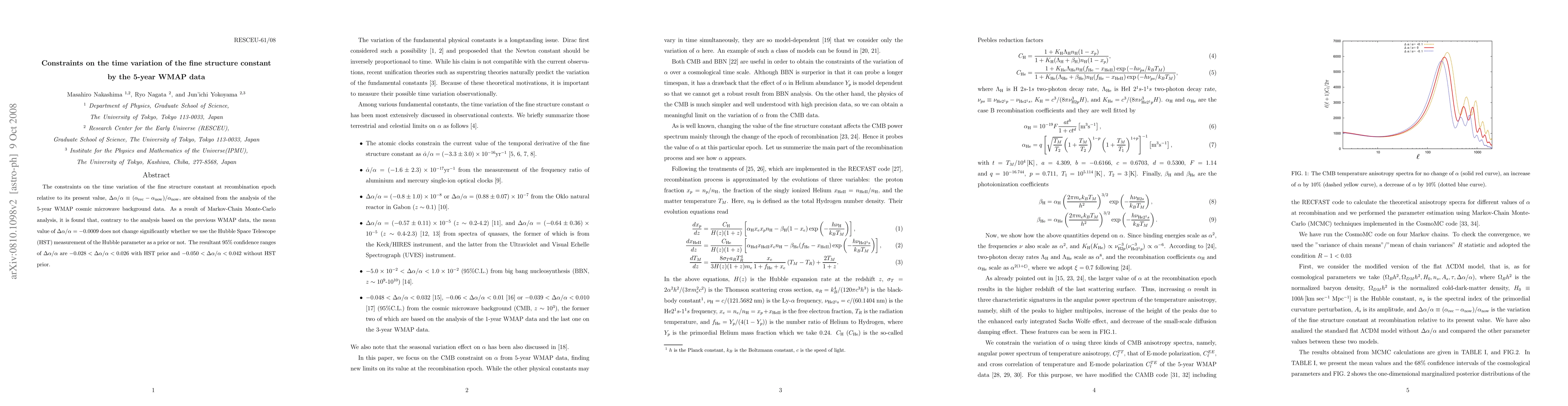 This paper analyzes 5-year WMAP data to constrain the time variation of the fine structure constant at the recombination epoch, finding a mean value of $\Delta\alpha/\alpha = -0.0009$ with 95% confidence ranges of $-0.028 < \Delta\alpha/\alpha < 0.026$ when using HST Hubble parameter measurements as a prior.
