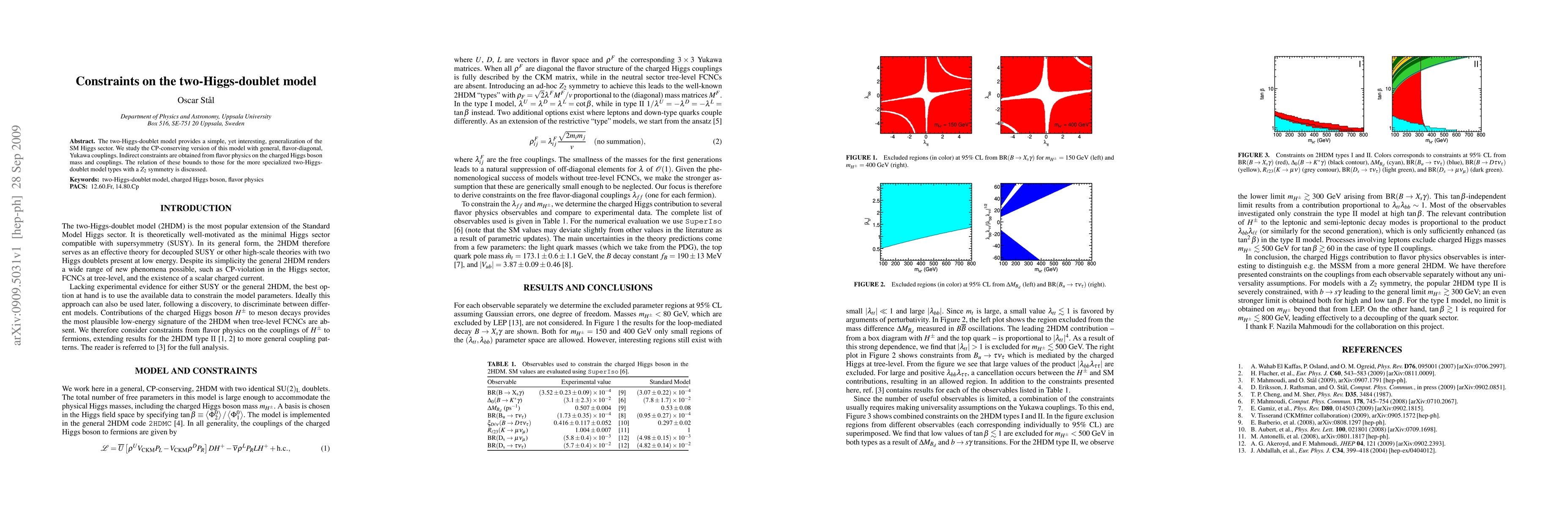 The two-Higgs-doublet model provides a simple, yet interesting, generalization of the SM Higgs sector. We study the CP-conserving version of this model with general, flavor-diagonal, Yukawa couplings. Indirect constraints are obtained from flavor physics on the charged Higgs boson mass and couplings. The relation of these bounds to those for the more specialized two-Higgs-doublet model types with a $Z_2$ symmetry is discussed.