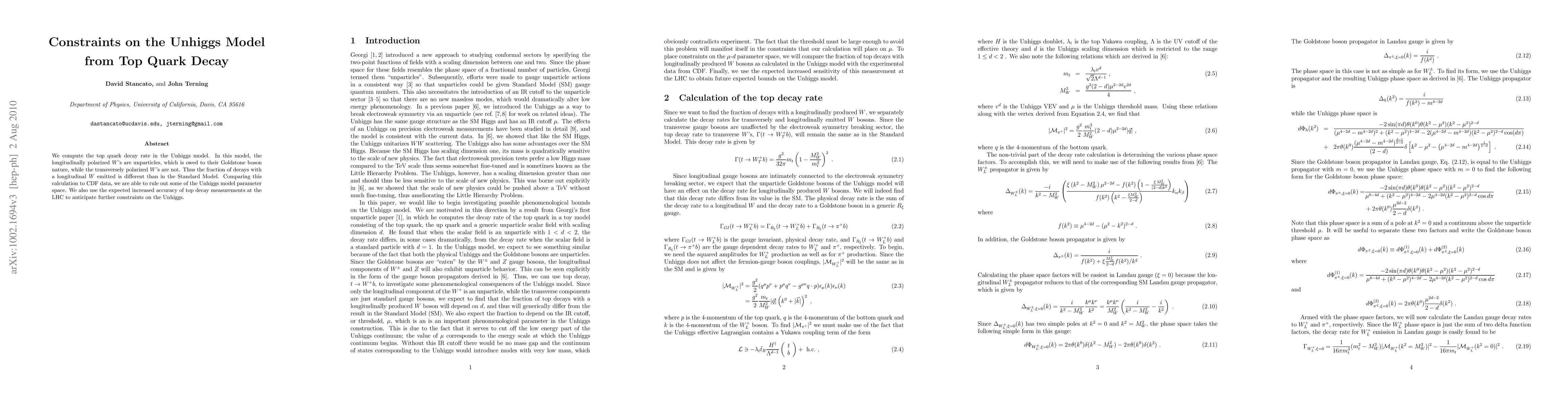 We compute the top quark decay rate in the Unhiggs model. In this model, the longitudinally polarized W's are unparticles, owing to their Goldstone boson nature, while the transversely polarized W's are not. Thus the fraction of decays with a longitudinal W emitted is different than in the Standard Model. Comparing this calculation to CDF data, we are able to rule out some of the Unhiggs model parameter space. We also use the expected increased accuracy of top decay measurements at the LHC to anticipate further constraints on the Unhiggs.