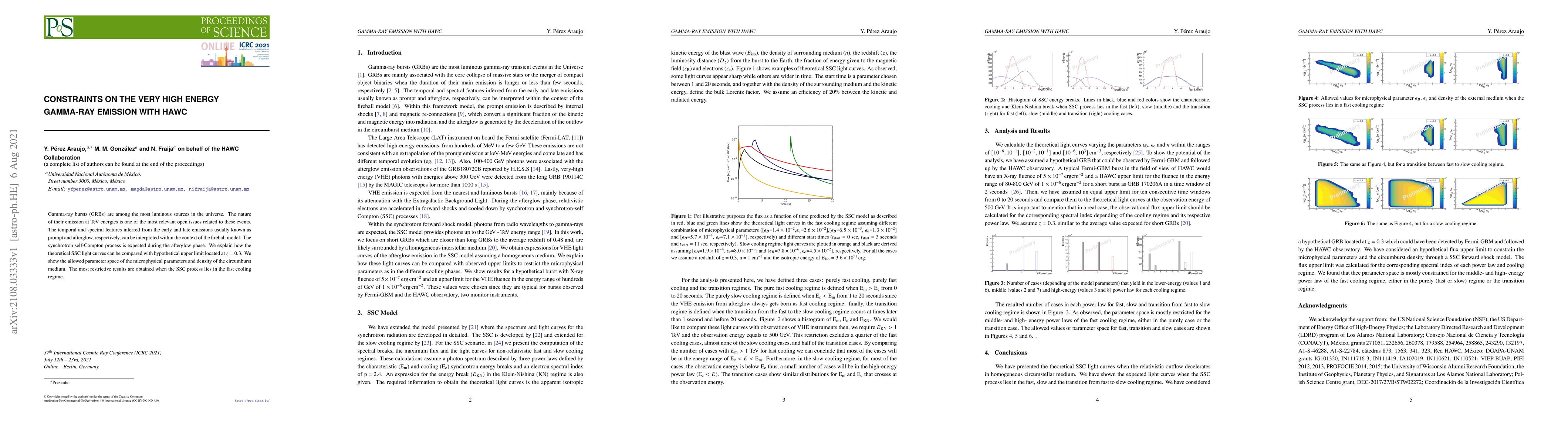 Researchers investigate Gamma-Ray Bursts at very high energy levels using HAWC data, finding constraints on emission processes and density of circumburst medium.