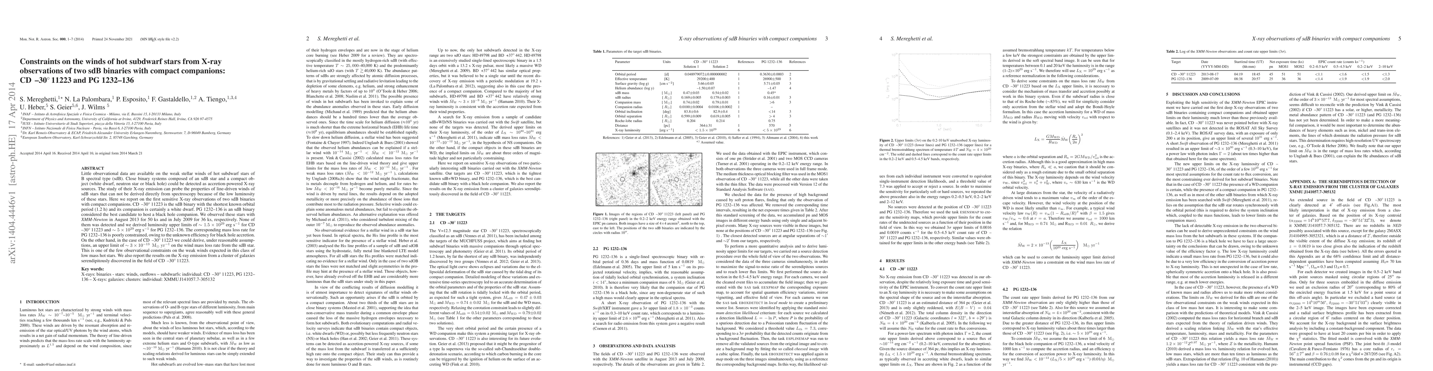 Little observational data are available on the weak stellar winds of hot subdwarf stars of B spectral type (sdB). Close binary systems composed of an sdB star and a compact object (white dwarf, neutron star or black hole) could be detected as accretion-powered X-ray sources. The study of their X-ray emission can probe the properties of line-driven winds of sdB stars that can not be derived directly from spectroscopy because of the low luminosity of these stars. Here we report on the first sensitive X-ray observations of two sdB binaries with compact companions. CD -30 11223 is the sdB binary with the shortest known orbital period (1.2 h) and its companion is certainly a white dwarf. PG 1232-136 is an sdB binary considered the best candidate to host a black hole companion. We observed these stars with XMM-Newton in August 2013 for 50 ks and in July 2009 for 36 ks, respectively. None of them was detected and we derived luminosity upper limits of about 1.5x10^29 erg/s for CD -30 11223 5x10^29 erg/s for PG 1232-136. The corresponding mass loss rate for PG 1232-136 is poorly constrained, owing to the unknown efficiency for black hole accretion. On the other hand, in the case of CD -30 11223 we could derive, under reasonable assumptions, an upper limit of about 3x10^-13 solar masses/yr on the wind mass loss rate from the sdB star. This is one of the few observational constraints on the weak winds expected in this class of low mass hot stars. We also report the results on the X-ray emission from a cluster of galaxies serendipitously discovered in the field of CD -30 11223.