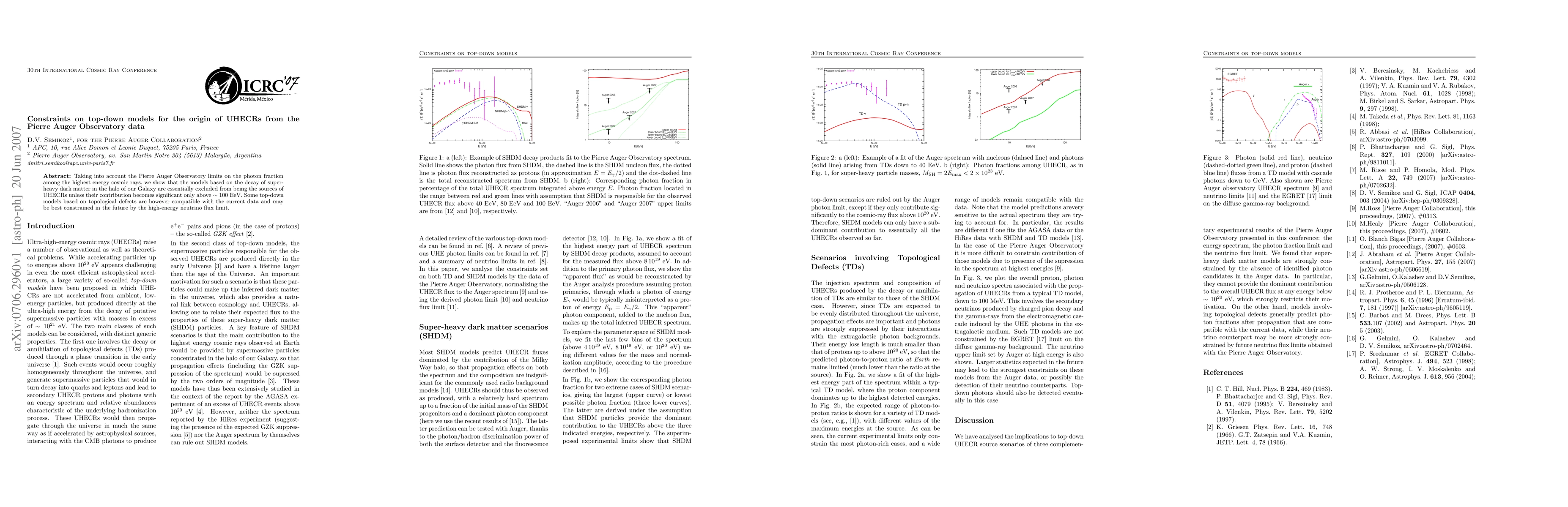 The Pierre Auger Observatory data constrains top-down models for ultra-high energy cosmic rays (UHECRs), largely ruling out decay of super-heavy dark matter in the Galaxy as a source. Some topological defect models remain compatible with current data, which could be further limited by future high-energy neutrino flux limits.