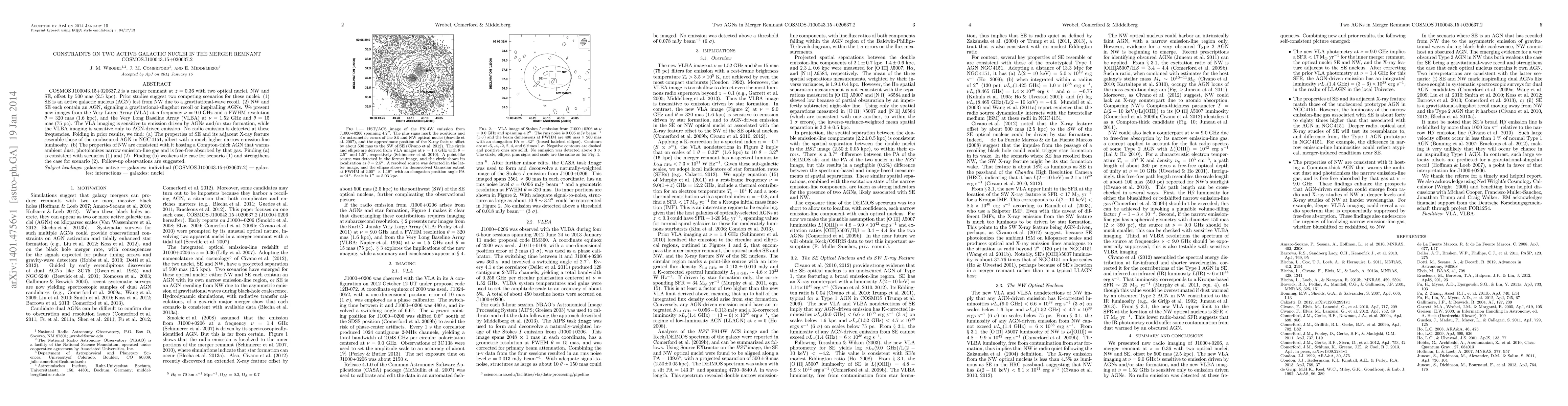 COSMOS J100043.15+020637.2 is a merger remnant at z = 0.36 with two optical nuclei, NW and SE, offset by 500 mas (2.5 kpc). Prior studies suggest two competing scenarios for these nuclei: (1) SE is an active galactic nucleus (AGN) lost from NW due to a gravitational-wave recoil. (2) NW and SE each contain an AGN, signaling a gravitational-slingshot recoil or inspiralling AGNs. We present new images from the Very Large Array (VLA) at a frequency nu = 9.0 GHz and a FWHM resolution theta = 320 mas (1.6 kpc), and the Very Long Baseline Array (VLBA) at nu = 1.52 GHz and theta = 15 mas (75 pc). The VLA imaging is sensitive to emission driven by AGNs and/or star formation, while the VLBA imaging is sensitive only to AGN-driven emission. No radio emission is detected at these frequencies. Folding in prior results, we find: (a) The properties of SE and its adjacent X-ray feature resemble those of the unobscured AGN in NGC 4151, albeit with a much higher narrow emission-line luminosity. (b) The properties of NW are consistent with it hosting a Compton-thick AGN that warms ambient dust, photoionizes narrow emission-line gas and is free-free absorbed by that gas. Finding (a) is consistent with scenarios (1) and (2). Finding (b) weakens the case for scenario (1) and strengthens the case for scenario (2). Follow-up observations are suggested.