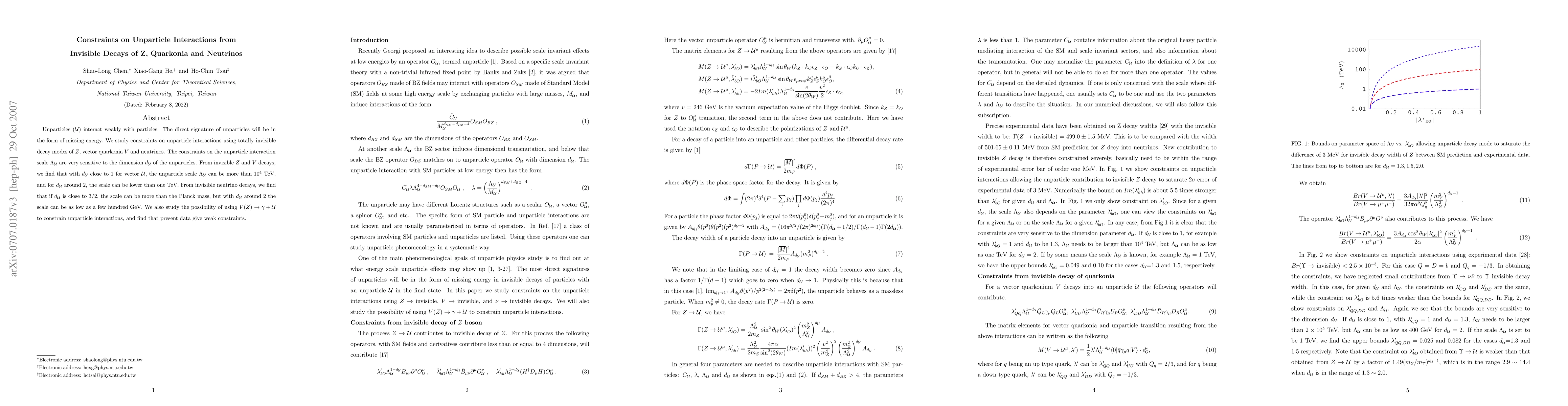 This paper investigates constraints on unparticle interactions through invisible decay modes of $Z$ bosons, quarkonia, and neutrinos, revealing that the unparticle interaction scale $\Lambda_\U$ varies significantly with the unparticle dimension $d_\U$. The study finds that $\Lambda_\U$ can exceed $10^4$ TeV for $d_\U$ near 1, but can be as low as a few hundred GeV for $d_\U$ around 2.