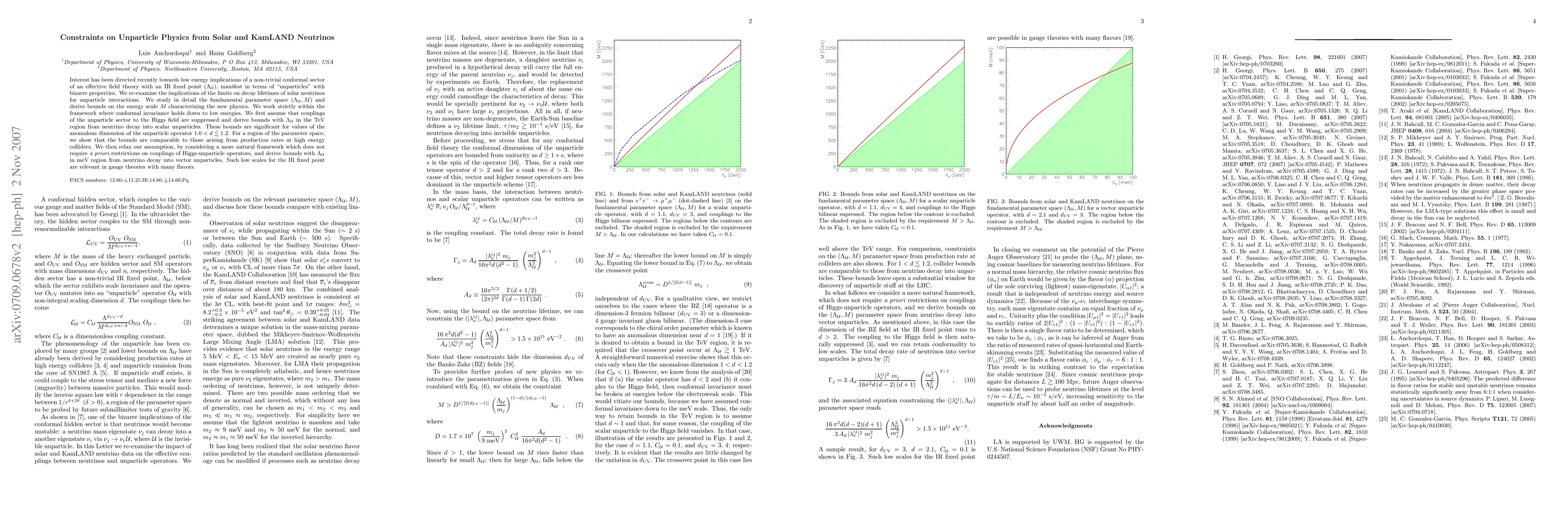 Interest has been directed recently towards low energy implications of a non-trivial conformal sector of an effective field theory with an IR fixed point (\Lambda), manifest in terms of ``unparticles'' with bizarre properties. We re-examine the implications of the limits on decay lifetimes of solar neutrinos for unparticle interactions. We study in detail the fundamental parameter space (\Lambda, M) and derive bounds on the energy scale M characterizing the new physics. We work strictly within the framework where conformal invariance holds down to low energies. We first assume that couplings of the unparticle sector to the Higgs field are suppressed and derive bounds with \Lambda in the TeV region from neutrino decay into scalar unparticles. These bounds are significant for values of the anomalous dimension of the unparticle operator 1.0 < d < 1.2. For a region of the parameter space, we show that the bounds are comparable to those arising from production rates at high energy colliders. We then relax our assumption, by considering a more natural framework which does not require a priori restrictions on couplings of Higgs-unparticle operators, and derive bounds with \Lambda in meV region from neutrino decay into vector unparticles. Such low scales for the IR fixed point are relevant in gauge theories with many flavors.