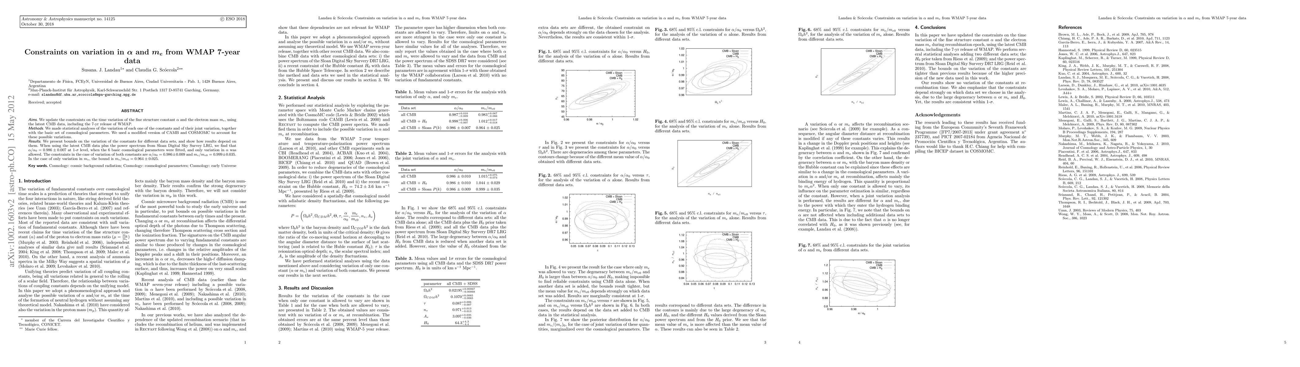 We update the constraints on the time variation of the fine structure constant $\alpha$ and the electron mass $m_e$, using the latest CMB data, including the 7-yr release of WMAP. We made statistical analyses of the variation of each one of the constants and of their joint variation, together with the basic set of cosmological parameters. We used a modified version of CAMB and COSMOMC to account for these possible variations. We present bounds on the variation of the constants for different data sets, and show how results depend on them. When using the latest CMB data plus the power spectrum from Sloan Digital Sky Survey LRG, we find that $\alpha / \alpha_0=0.986 \pm 0.007$ at 1-$\sigma$ level, when the 6 basic cosmological parameters were fitted, and only variation in $\alpha$ was allowed. The constraints in the case of variation in both constants are $ \alpha / \alpha_0= 0.986 \pm 0.009$ and $m_e / m_{e0} = 0.999 \pm 0.035$. In the case of only variation in $m_e$, the bound is $m_e /m_{e0}=0.964 \pm 0.025$.