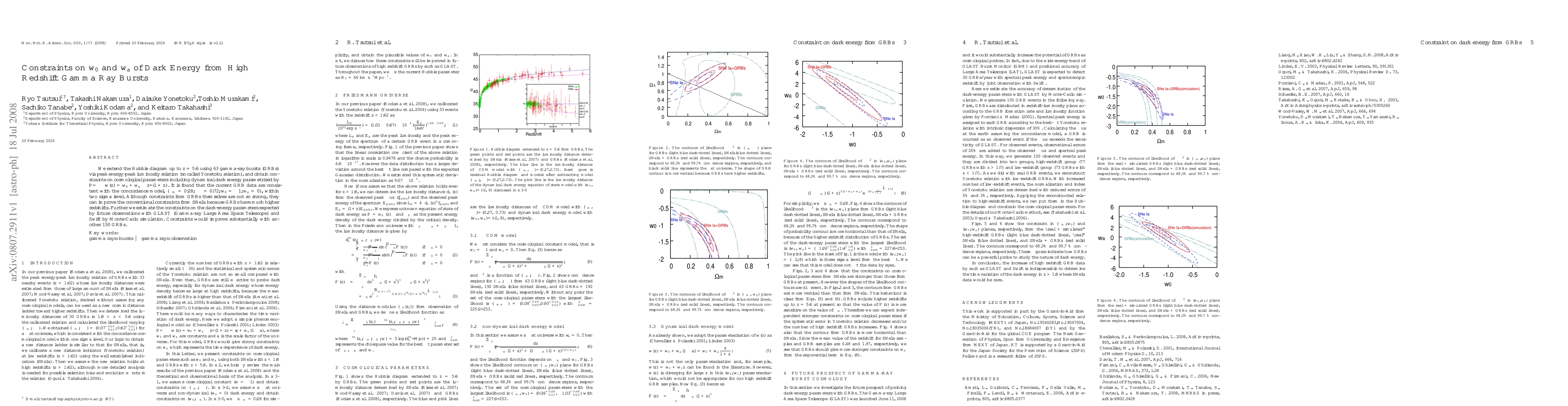 This paper uses high redshift gamma-ray bursts (GRBs) to extend the Hubble diagram and constrain dark energy parameters $w_0$ and $w_a$. The results are consistent with the concordance model within two sigma, and future observations with GLAST and \swift could significantly improve these constraints.
