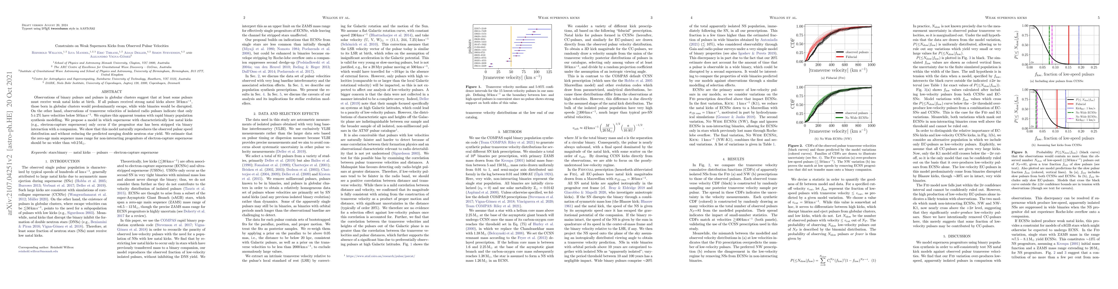 This paper investigates the discrepancy between the expected high natal kicks from supernovae and the observed low velocities of some pulsars, proposing a model where low kicks occur only for stripped progenitor stars, thus reconciling the observed pulsar speed distribution without affecting neutron star merger rates. The model suggests that the mass range for non-interacting progenitors of electron-capture supernovae is limited to approximately 0.2 solar masses.