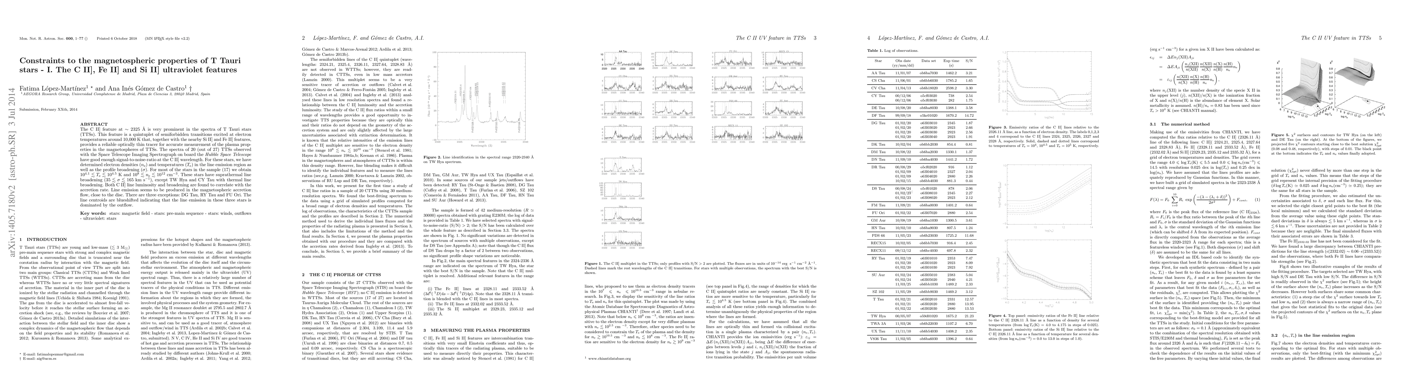 The C II] feature at ~2325 Angstrom is very prominent in the spectra of T Tauri stars (TTSs). This feature is a quintuplet of semiforbidden transitions excited at electron temperatures around 10,000 K that, together with the nearby Si II] and Fe II] features, provides a reliable optically thin tracer for accurate measurement of the plasma properties in the magnetospheres of TTSs. The spectra of 20 (out of 27) TTSs observed with the Space Telescope Imaging Spectrograph (STIS) on board the Hubble Space Telescope (HST) have good enough signal to noise ratio (S/N) at the C II] wavelength. For these stars we have determined electron densities (ne) and temperatures (Te) in the line emission region as well as the profile broadening (sigma). For most of the stars in the sample (17) we obtain 10^{4.1} < Te < 10^{4.5} K and 10^{8} < ne < 10^{12} cm^{-3}. These stars have suprathermal line broadening (35 < sigma < 165 km s^{-1}), except TW Hya and CY Tau with thermal line broadening. Both C II] line luminosity and broadening are found to correlate with the accretion rate. Line emission seems to be produced in the magnetospheric accretion flow, close to the disk. There are three exceptions: DG Tau, RY Tau and FU Ori. The line centroids are blueshifted indicating that the line emission in these three stars is dominated by the outflow.