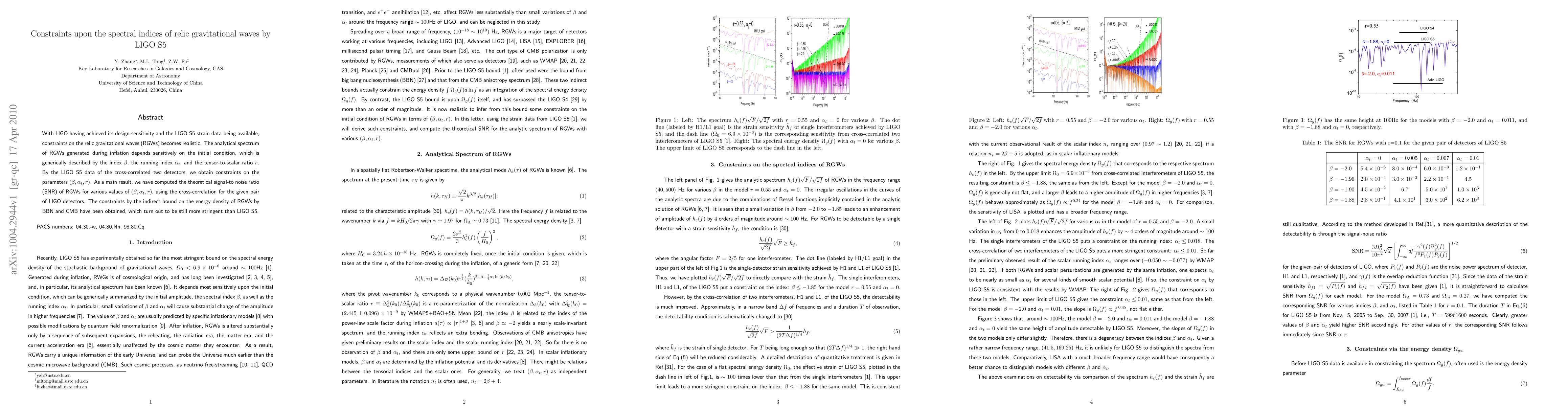 This paper uses LIGO S5 data to constrain the spectral indices of relic gravitational waves (RGWs) generated during inflation, focusing on parameters $\beta$, $\alpha_t$, and $r$. The study finds that constraints derived from LIGO S5 are more stringent than those from indirect bounds based on Big Bang Nucleosynthesis (BBN) and Cosmic Microwave Background (CMB) observations.