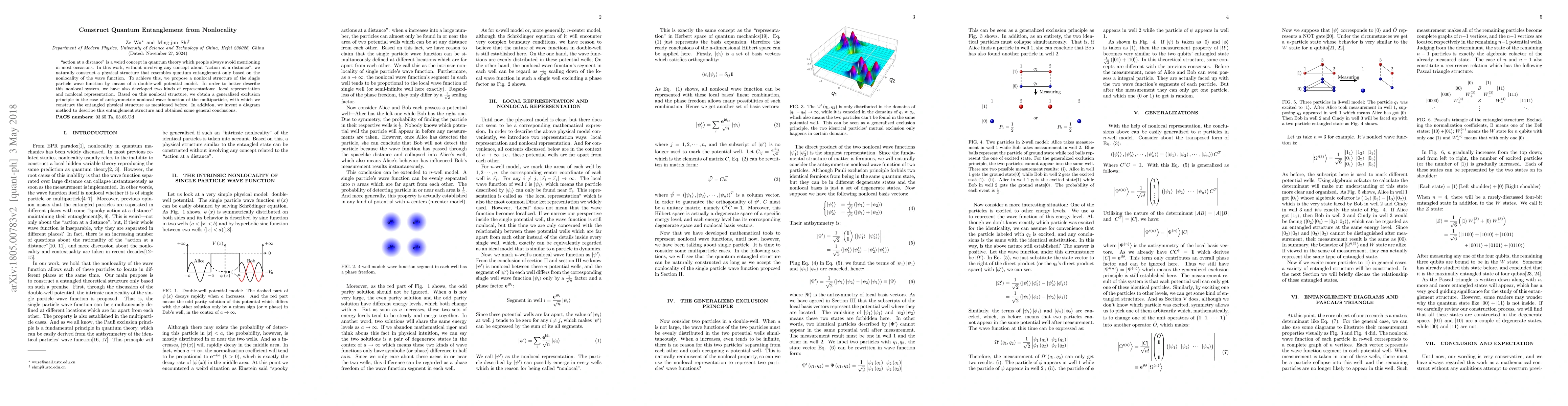 "action at a distance" is a weird concept in quantum theory which people always avoid mentioning in most occasions. In this work, without involving any concept about "action at a distance", we naturally construct a physical structure that resembles quantum entanglement only based on the nonlocality of the wave function. To achieve this, we propose a nonlocal structure of the single particle wave function by means of a double-well potential model. In order to better describe this nonlocal system, we have also developed two kinds of representations: local representation and nonlocal representation. Based on this nonlocal structure, we obtain a generalized exclusion principle in the case of antisymmetric nonlocal wave function of the multiparticle, with which we construct the entangled physical structure as mentioned before. In addition, we invent a diagram method to describe this entanglement structure and obtained some general conclusions.
