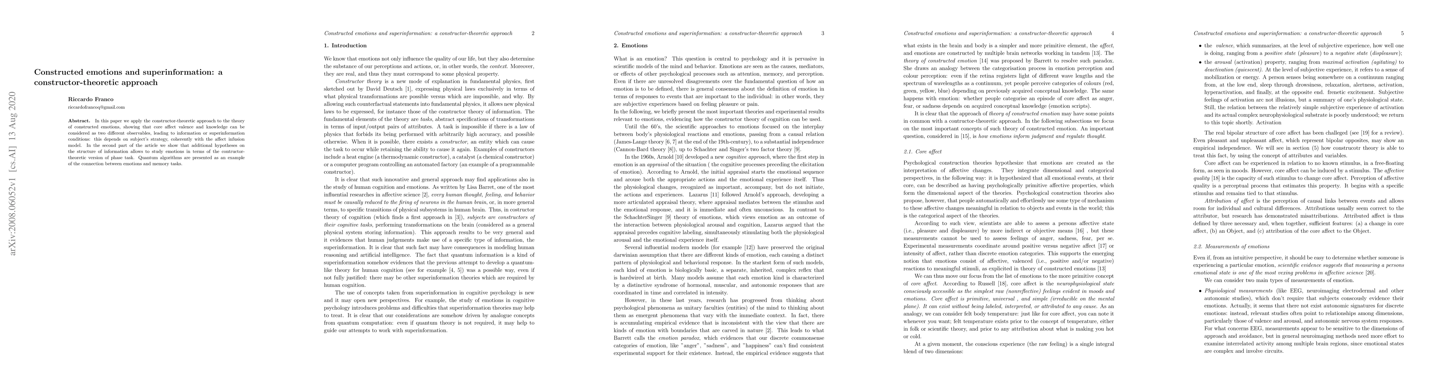 In this paper we apply the constructor-theoretic approach to the theory of constructed emotions, showing that core affect valence and knowledge can be considered as two different observables, leading to information or superinformation conditions: this depends on subject's strategy, coherently with the affect infusion model. In the second part of the article we show that additional hypotheses on the structure of information allows to study emotions in terms of the contructor-theoretic version of phase task. Quantum algorithms are presented as an example of the connection between emotions and memory tasks.