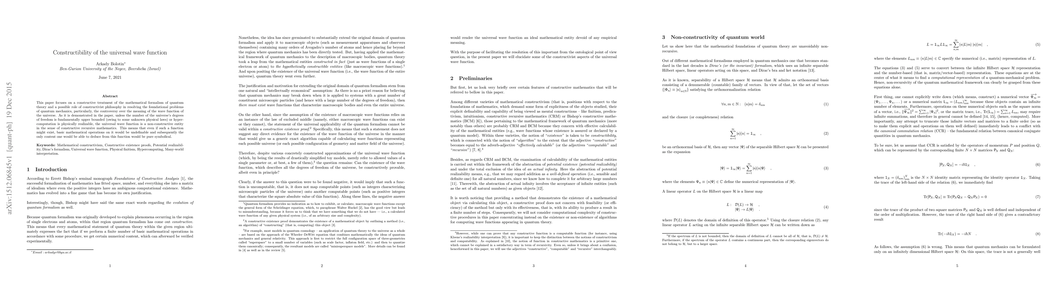 This paper focuses on a constructive treatment of the mathematical formalism of quantum theory and a possible role of constructivist philosophy in resolving the foundational problems of quantum mechanics, particularly, the controversy over the meaning of the wave function of the universe. As it is demonstrated in the paper, unless the number of the universe's degrees of freedom is fundamentally upper bounded (owing to some unknown physical laws) or hypercomputation is physically realizable, the universal wave function is a non-constructive entity in the sense of constructive recursive mathematics. This means that even if such a function might exist, basic mathematical operations on it would be undefinable and subsequently the only content one would be able to deduce from this function would be pure symbolical.