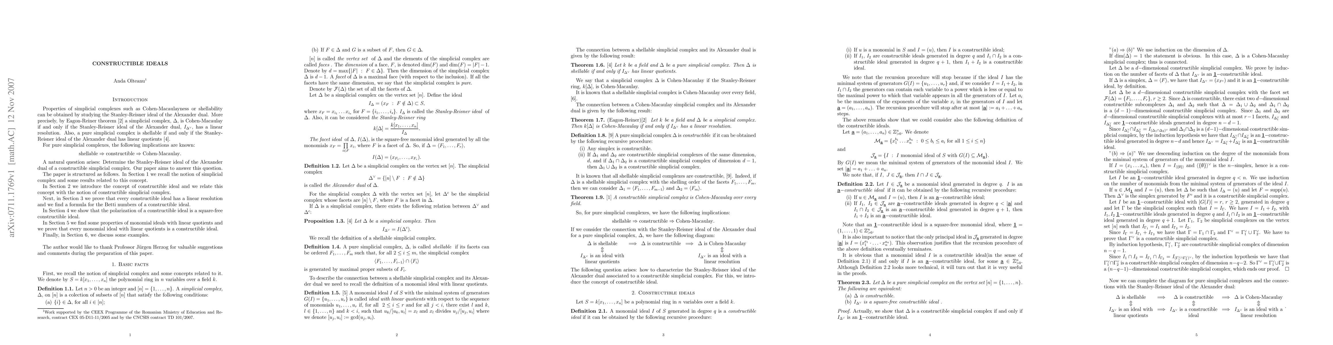 Summary: This paper introduces constructible ideals and connects them to constructible simplicial complexes, exploring several properties of these ideals in detail. The study aims to establish a deeper understanding of the relationship between these mathematical constructs.