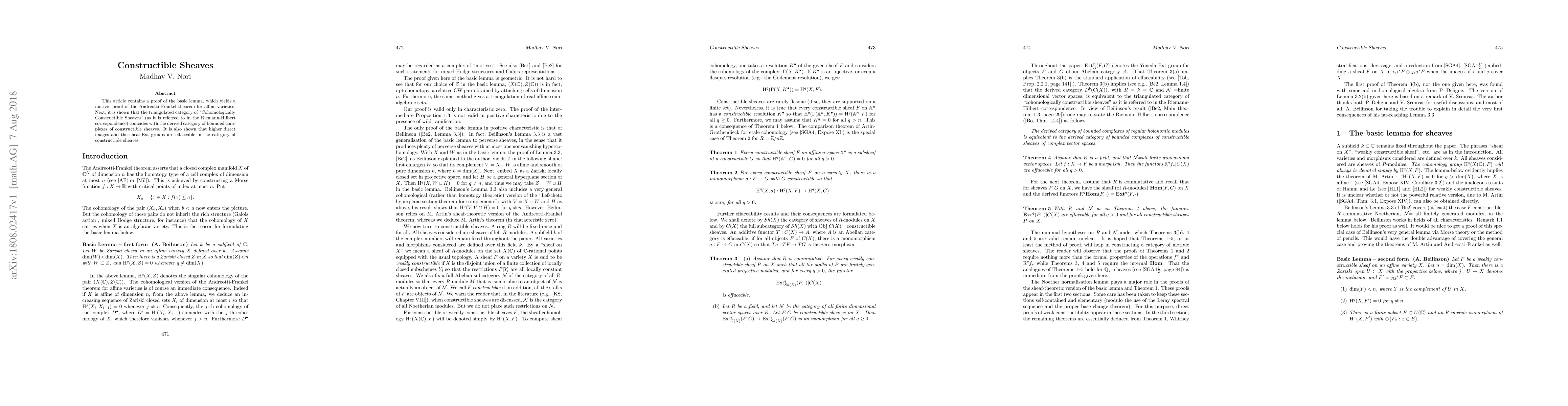 This article contains a proof of the basic lemma. This lemma, discovered by Beilinson, yields a motivic proof of the Andreotti-Frankel theorem for affine varieties. Next, it is shown that the category of Cohomologically Constructible Sheaves (as it is referred to in the Riemann-Hilbert correspondence) coincides with the derived category of bounded complexes of constructible sheaves. It is also shown that higher direct images and the sheaf-Ext groups are effaceable in the category of constructible sheaves.