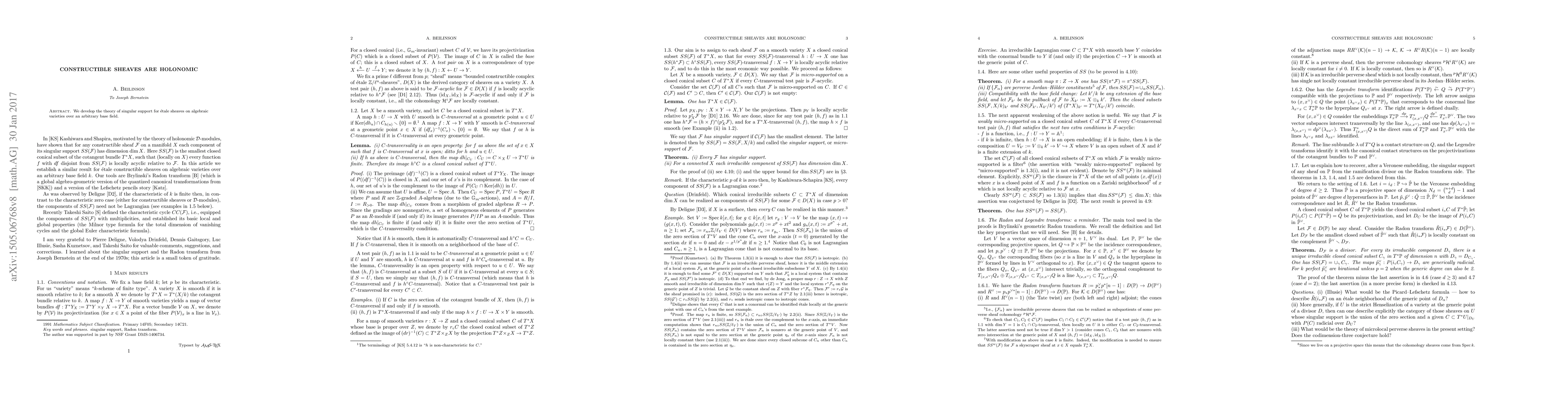 Summary: The paper demonstrates that the singular support of any constructible sheaf on a smooth algebraic variety is equidimensional and matches the dimension of the variety. This establishes the holonomicity of constructible sheaves.