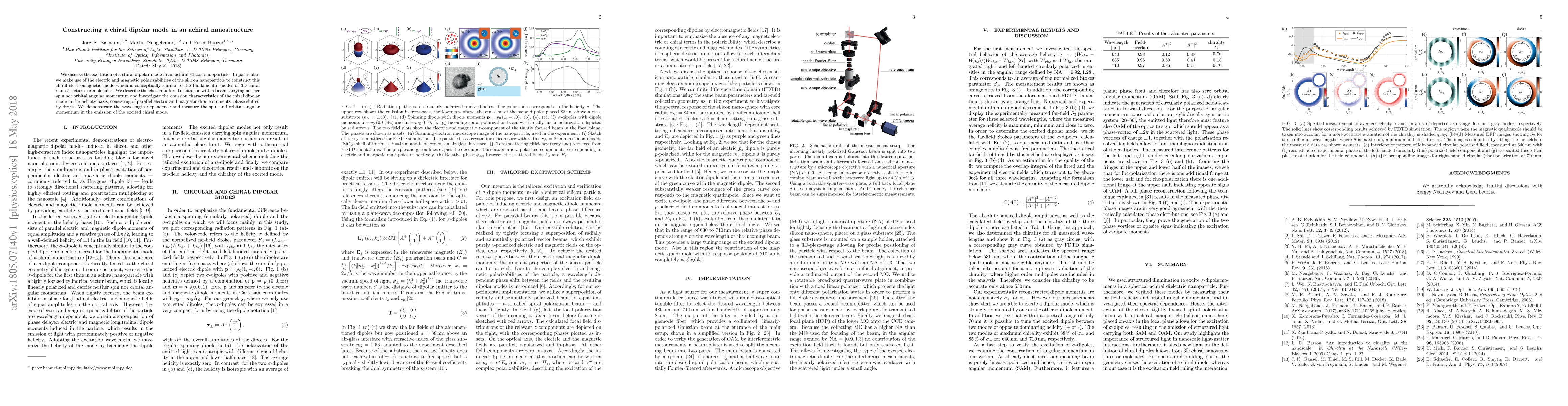 We discuss the excitation of a chiral dipolar mode in an achiral silicon nanoparticle. In particular, we make use of the electric and magnetic polarizabilities of the silicon nanoparticle to construct this chiral electromagnetic mode which is conceptually similar to the fundamental modes of 3D chiral nanostructures or molecules. We describe the chosen tailored excitation with a beam carrying neither spin nor orbital angular momentum and investigate the emission characteristics of the chiral dipolar mode in the helicity basis, consisting of parallel electric and magnetic dipole moments, phase shifted by $\pm \pi/2$. We demonstrate the wavelength dependence and measure the spin and orbital angular momentum in the emission of the excited chiral mode.