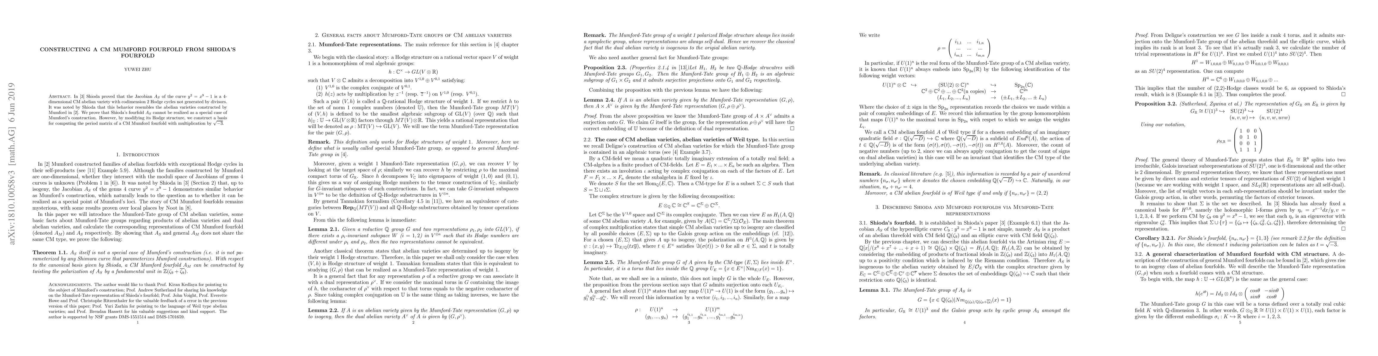 Researchers prove that Shioda's fourfold cannot be constructed using Mumford's method but create a modified version with a new basis for computing its period matrix.