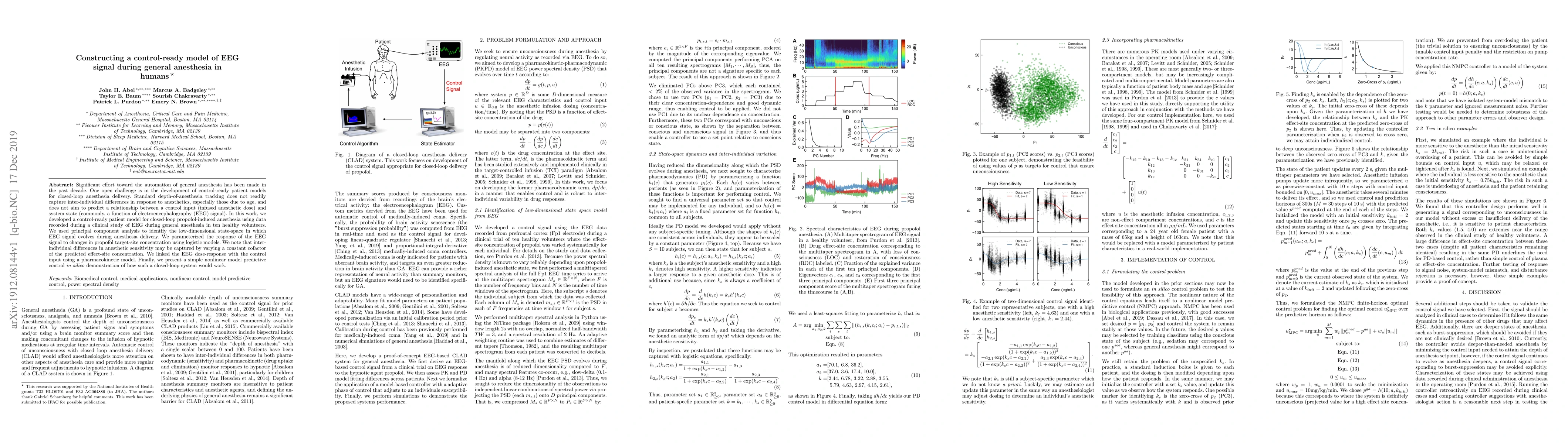 Significant effort toward the automation of general anesthesia has been made in the past decade. One open challenge is in the development of control-ready patient models for closed-loop anesthesia delivery. Standard depth-of-anesthesia tracking does not readily capture inter-individual differences in response to anesthetics, especially those due to age, and does not aim to predict a relationship between a control input (infused anesthetic dose) and system state (commonly, a function of electroencephalography (EEG) signal). In this work, we developed a control-ready patient model for closed-loop propofol-induced anesthesia using data recorded during a clinical study of EEG during general anesthesia in ten healthy volunteers. We used principal component analysis to identify the low-dimensional state-space in which EEG signal evolves during anesthesia delivery. We parameterized the response of the EEG signal to changes in propofol target-site concentration using logistic models. We note that inter-individual differences in anesthetic sensitivity may be captured by varying a constant cofactor of the predicted effect-site concentration. We linked the EEG dose-response with the control input using a pharmacokinetic model. Finally, we present a simple nonlinear model predictive control in silico demonstration of how such a closed-loop system would work.
