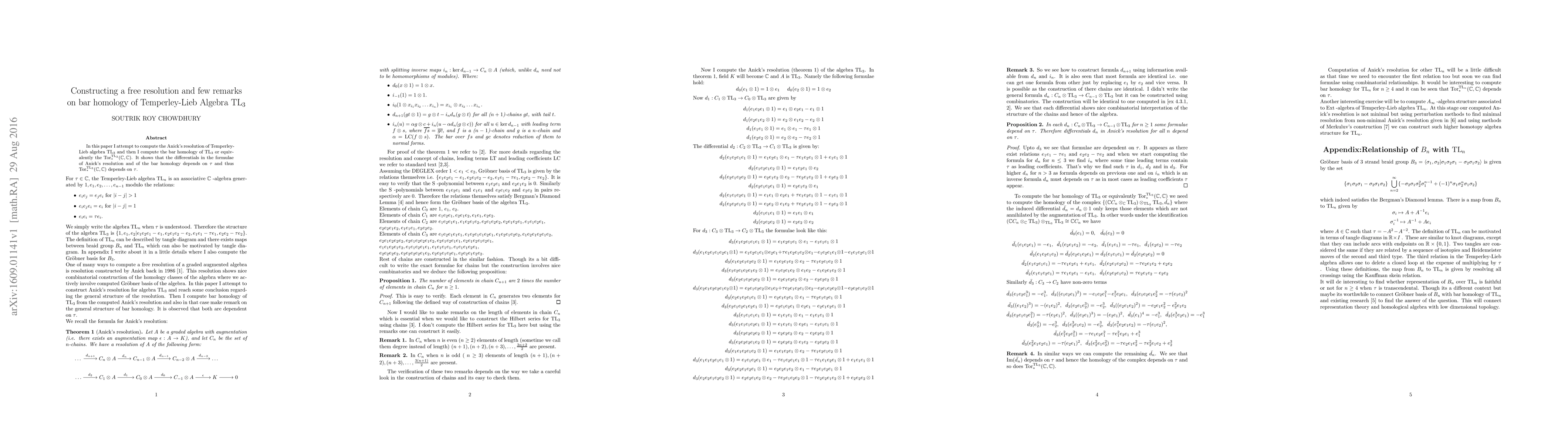Researchers constructed a free resolution for Temperley-Lieb algebra $TL_3$ and found that its bar homology depends on the value of $ au$, highlighting the significance of $ au$ in the structure of $TL_3$.