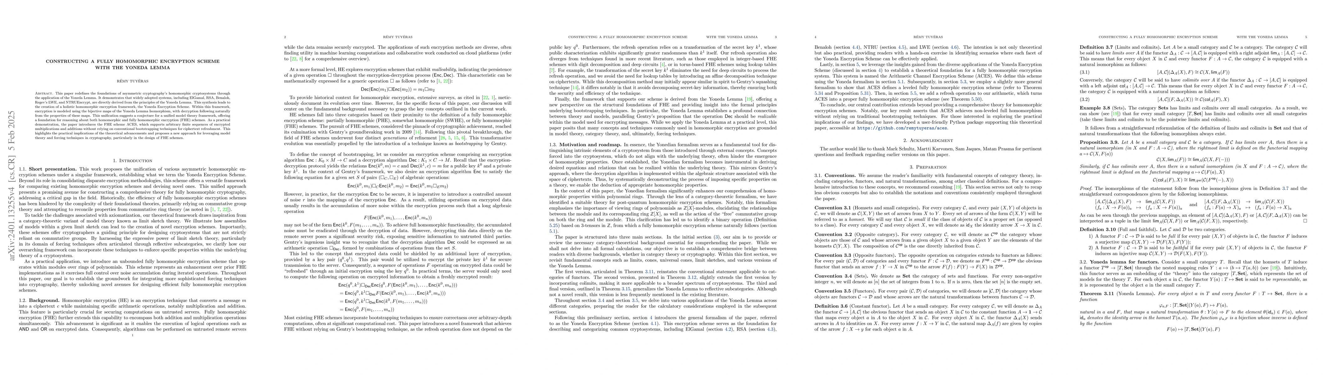 This paper redefines the foundations of asymmetric cryptography's homomorphic cryptosystems through the application of the Yoneda Lemma. It explicitly illustrates that widely adopted systems, including ElGamal, RSA, Benaloh, Regev's LWE, and NTRUEncrypt, directly derive from the principles of the Yoneda Lemma. This synthesis gives rise to a holistic homomorphic encryption framework named the Yoneda Encryption Scheme. Within this scheme, encryption is elucidated through the bijective maps of the Yoneda Lemma Isomorphism, and decryption seamlessly follows from the naturality of these maps. This unification suggests a conjecture for a unified model theory framework, providing a basis for reasoning about both homomorphic and fully homomorphic encryption (FHE) schemes. As a practical demonstration, the paper introduces an FHE scheme capable of processing arbitrary finite sequences of encrypted multiplications and additions without the need for additional tweaking techniques, such as squashing or bootstrapping. This not only underscores the practical implications of the proposed theoretical advancements but also introduces new possibilities for leveraging model theory and forcing techniques in cryptography to facilitate the design of FHE schemes.