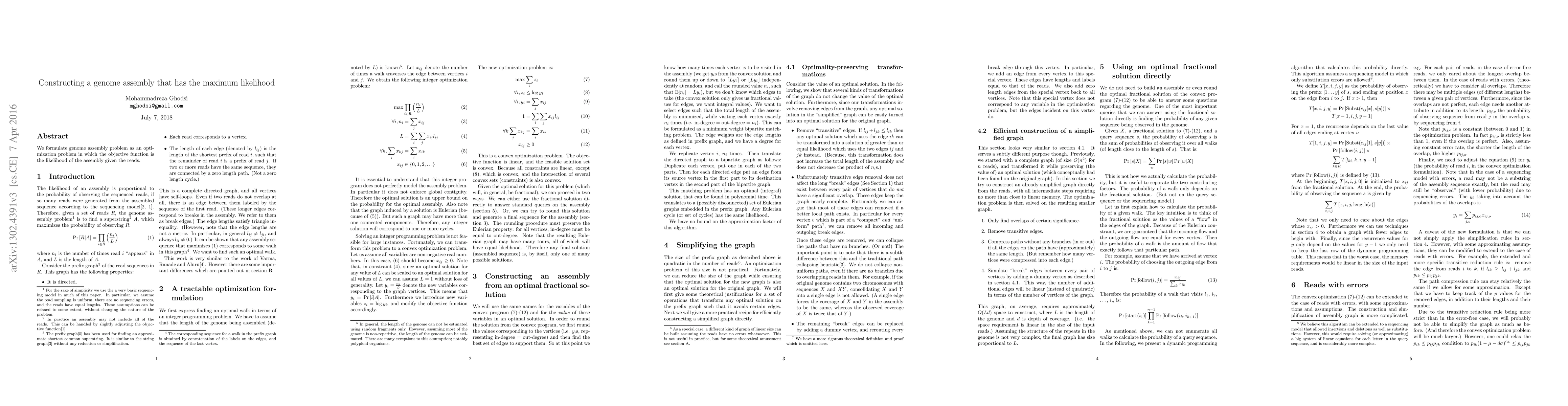 We formulate genome assembly problem as an optimization problem in which the objective function is the likelihood of the assembly given the reads.