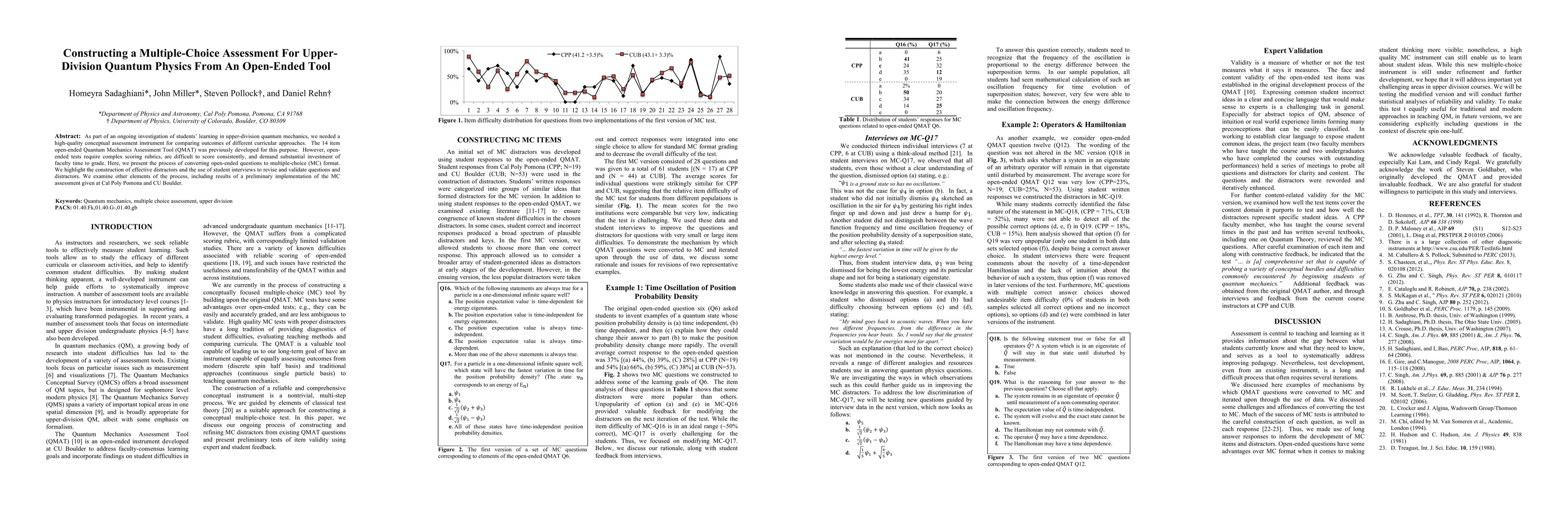 This paper details the conversion of an open-ended Quantum Mechanics Assessment Tool (QMAT) into a multiple-choice format to facilitate easier grading and comparison of student learning outcomes. The authors emphasize the creation of effective distractors and the use of student interviews for validation, alongside preliminary implementation results from two universities.
