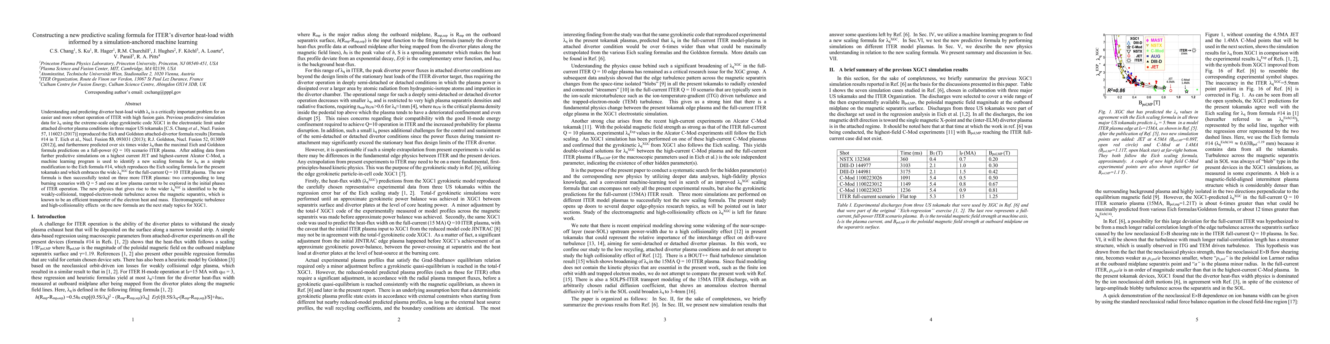 Understanding and predicting divertor heat-load width ${\lambda}_q$ is a critically important problem for an easier and more robust operation of ITER with high fusion gain. Previous predictive simulation data for ${\lambda}_q$ using the extreme-scale edge gyrokinetic code XGC1 in the electrostatic limit under attached divertor plasma conditions in three major US tokamaks [C.S. Chang et al., Nucl. Fusion 57, 116023 (2017)] reproduced the Eich and Goldston attached-divertor formula results [formula #14 in T. Eich et al., Nucl. Fusion 53, 093031 (2013); R.J. Goldston, Nucl. Fusion 52, 013009 (2012)], and furthermore predicted over six times wider ${\lambda}_q$ than the maximal Eich and Goldston formula predictions on a full-power (Q = 10) scenario ITER plasma. After adding data from further predictive simulations on a highest current JET and highest-current Alcator C-Mod, a machine learning program is used to identify a new scaling formula for ${\lambda}_q$ as a simple modification to the Eich formula #14, which reproduces the Eich scaling formula for the present tokamaks and which embraces the wide ${\lambda}_q^X{GC}$ for the full-current Q = 10 ITER plasma. The new formula is then successfully tested on three more ITER plasmas: two corresponding to long burning scenarios with Q = 5 and one at low plasma current to be explored in the initial phases of ITER operation. The new physics that gives rise to the wider ${\lambda}q_^{XGC} is identified to be the weakly-collisional, trapped-electron-mode turbulence across the magnetic separatrix, which is known to be an efficient transporter of the electron heat and mass. Electromagnetic turbulence and high-collisionality effects on the new formula are the next study topics for XGC1.